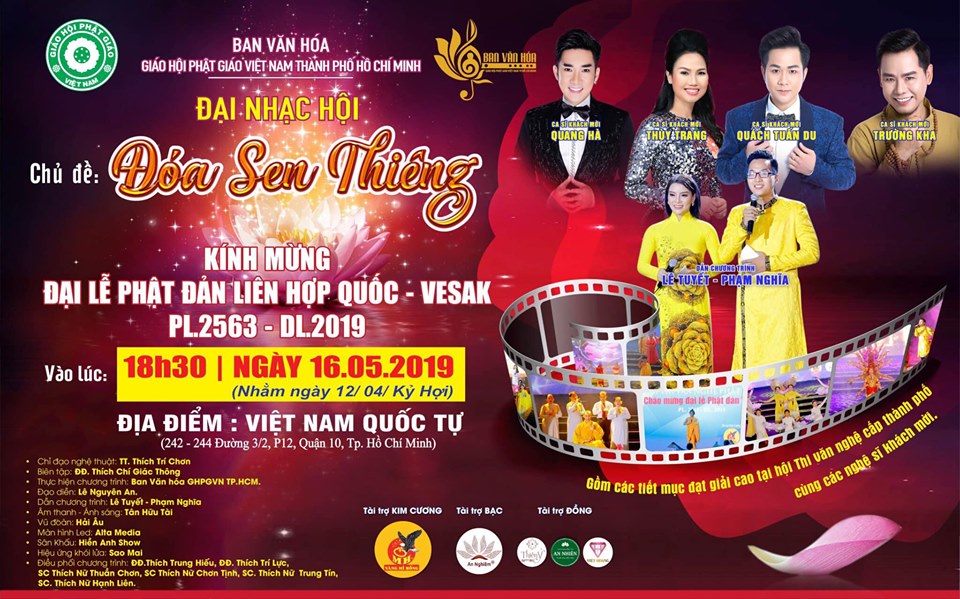 Đêm nhạc chủ đề: Đoá sen thiêng sẽ diễn ra vào lúc 19h 00 ngày 12 tháng 04 năm Kỷ hợi (16/5/2019) tại Trụ sở VP Ban Trị sự GHPGVN TP.HCM – sân lễ Việt Nam Quốc Tự, đường 3/2, Q.10, TP.HCM.