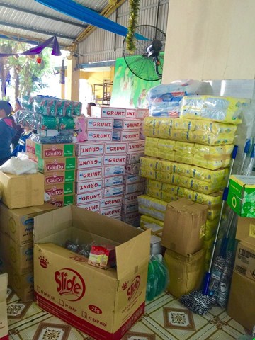 Tại đây, phái đoàn từ thiện đã gửi tặng gạo, mỳ gói, sữa bột, bánh, kẹo, sữa tươi, tã lót, xà bông … và nhóm sinh viên thiện nguyện trường Đại học HUTECH dọn dẹp vệ sinh sạch sẽ phòng ốc nơi các em đang cư trú.