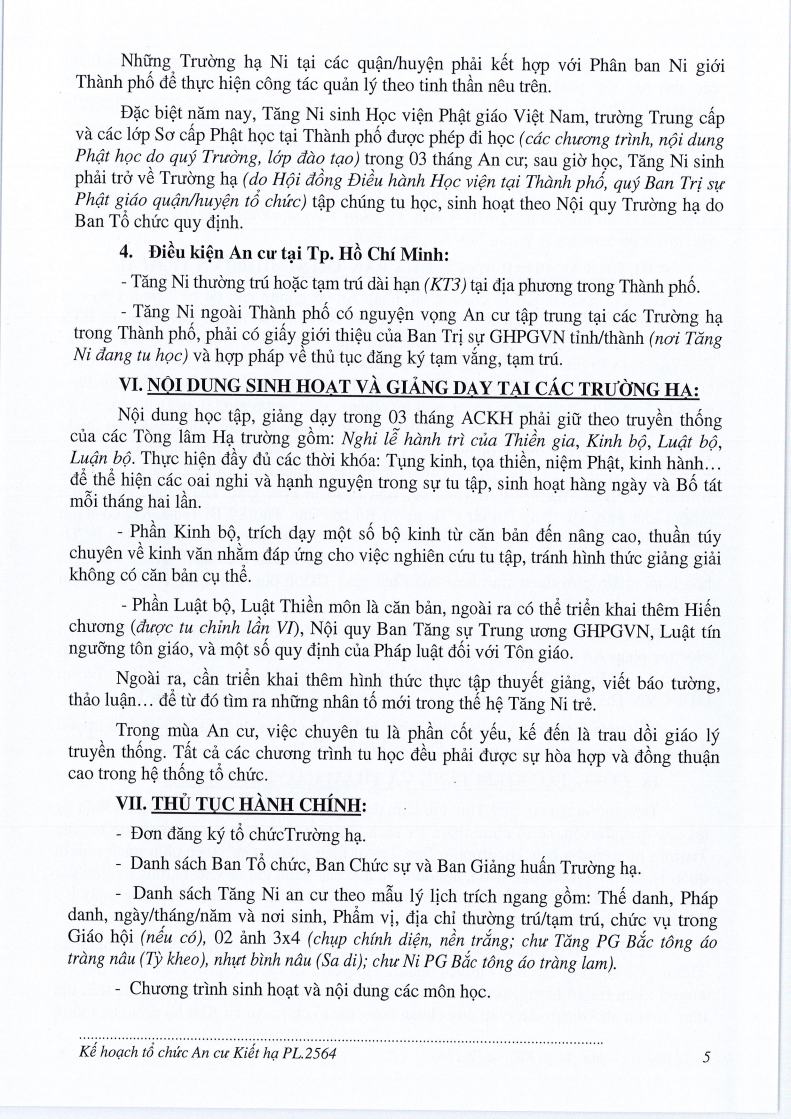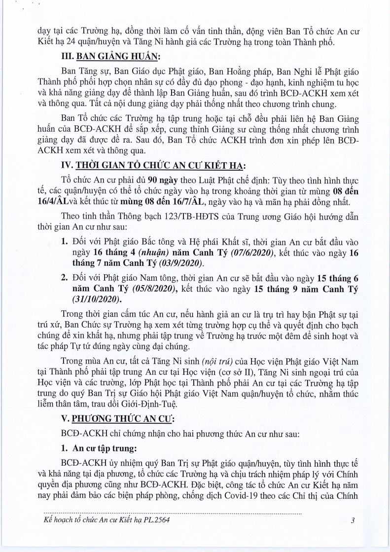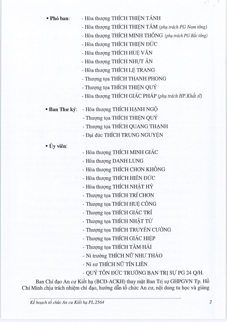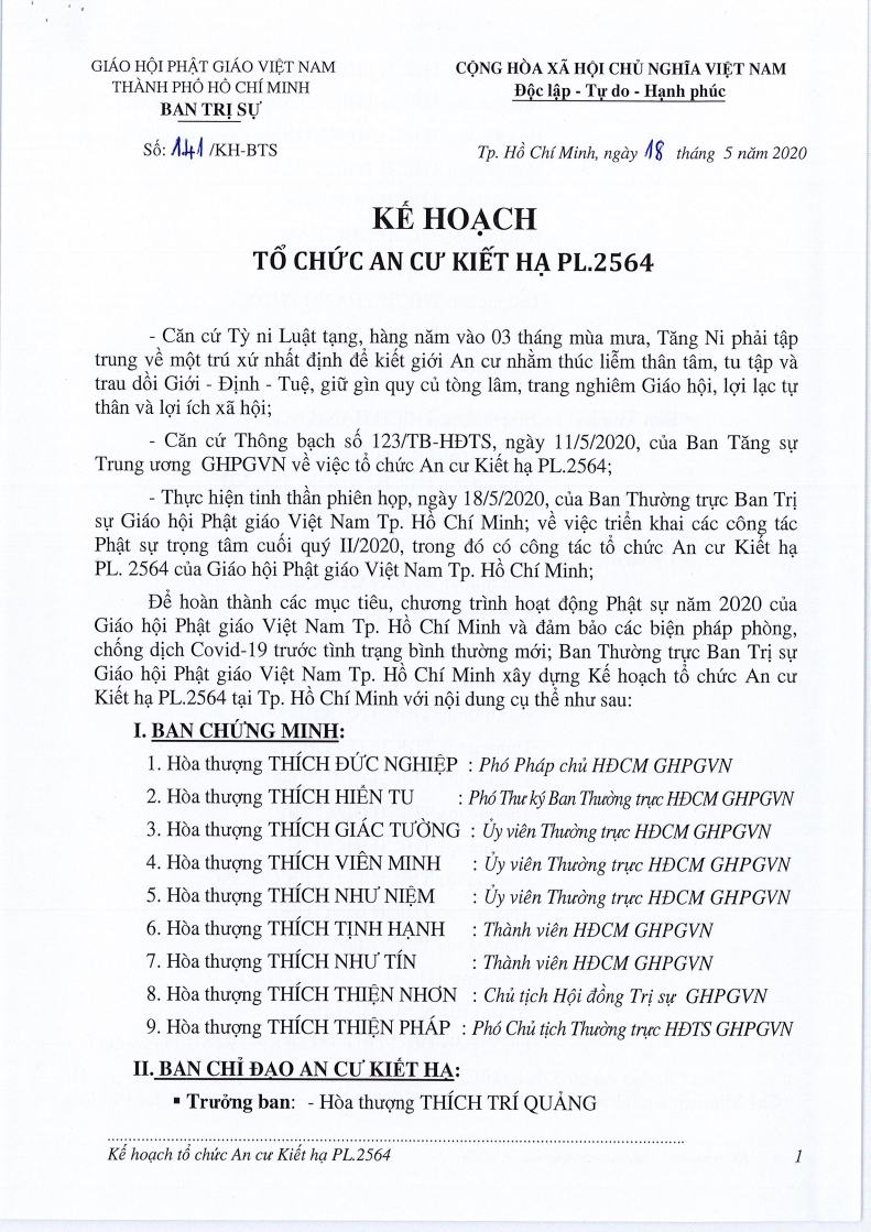 Để hoàn thành các mục tiêu, chương trình hoạt động Phật sự năm 2020 của Giáo hội Phật giáo Việt Nam Tp. Hồ Chí Minh và đảm bảo các biện pháp phòng, chống dịch Covid-19 trước tình trạng bình thường mới; Ban Thường trực Ban Trị sự Giáo hội Phật giáo Việt Nam Tp. Hồ Chí Minh xây dựng Kế hoạch tổ chức An cư Kiết hạ PL.2564 tại Tp. Hồ Chí Minh cung thỉnh Ban chứng minh gồm 9 thành viên, Ban chỉ đạo An cư kiết hạ do HT.Thích Trí Quảng làm trưởng ban, với chư tôn đức là Phó ban, Thư ký, Ủy viên và Trưởng Ban trị sự 24 quận huyện;