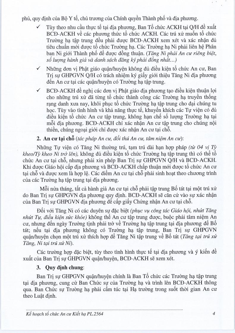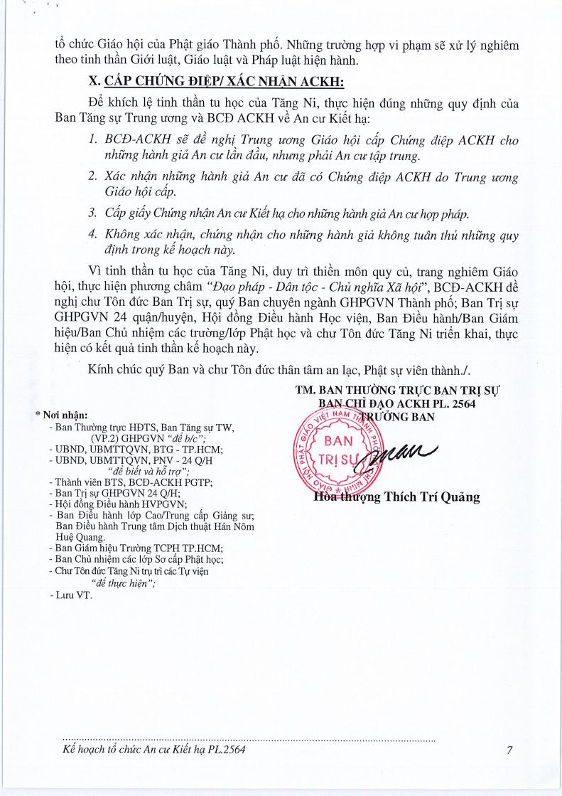 Kế hoạch tổ chức An cư kiết hạ Pl.2564 do HT.Thích Trí Quảng – Phó Pháp chủ kiêm Giám luật HĐCM, Trưởng BTS GHPGVN TP.HCM ấn ký.