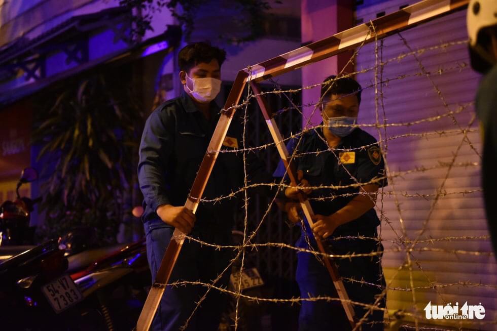 Các cán bộ, chiến sĩ đang tiến hành dựng hàng rào tại một đoạn đường ở quận Gò Vấp