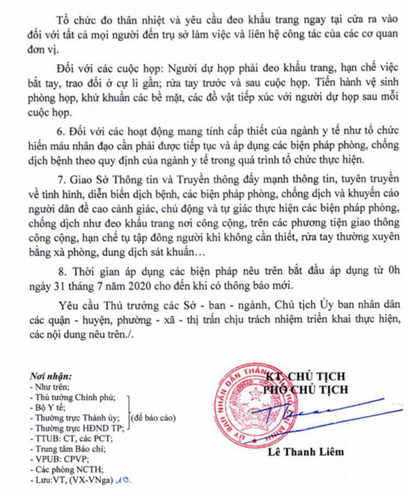 Thời gian áp dụng các biện pháp nêu trên bắt đầu từ 0h ngày 31-7-2020 đến khi có thông báo mới.