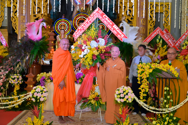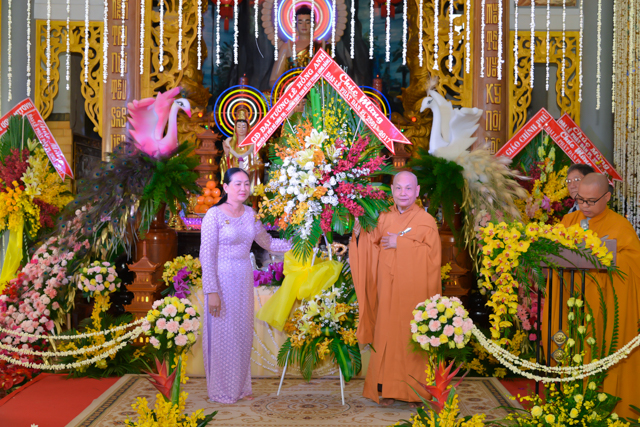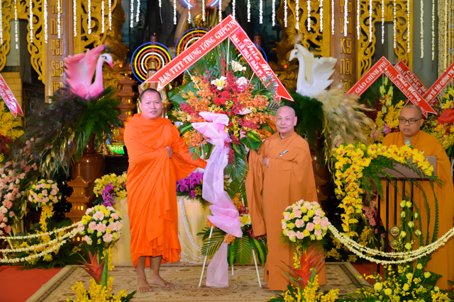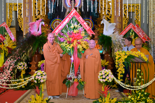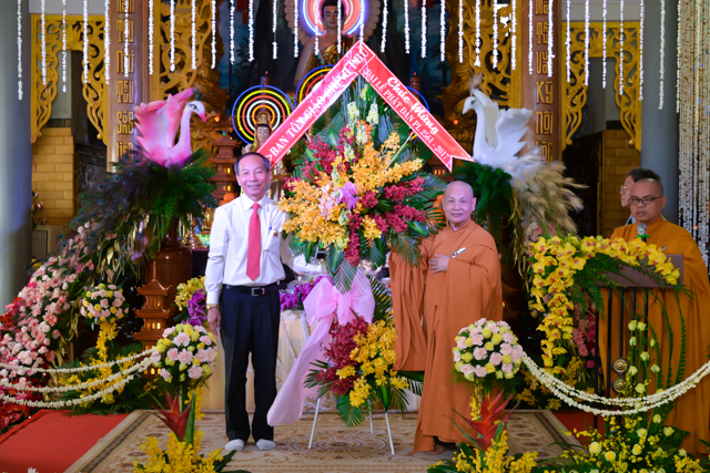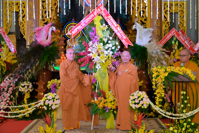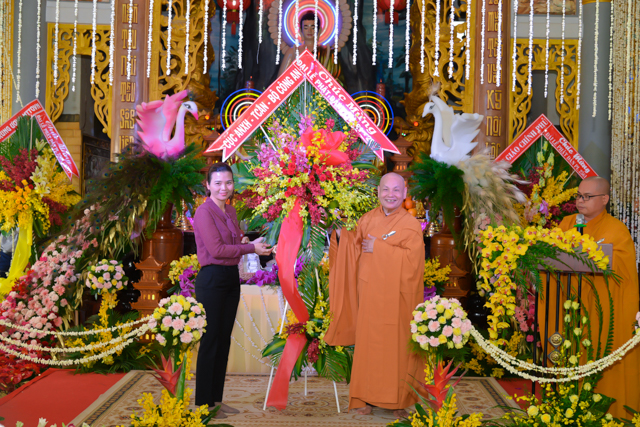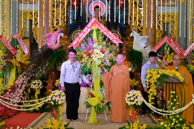 Trong buổi lễ, Ban tổ chức cũng đón nhận những lẵng hoa, phần quà chúc mừng của lãnh đạo chính quyền gửi tới chúc mừng Đại lễ Phật đản Hòa thượng Chủ tịch HĐTS tại chùa Minh Đạo.