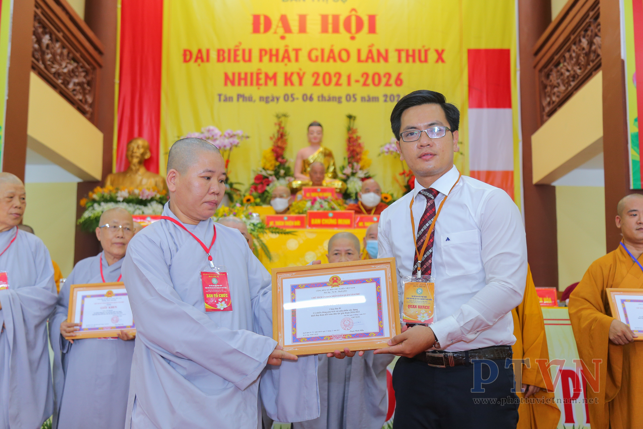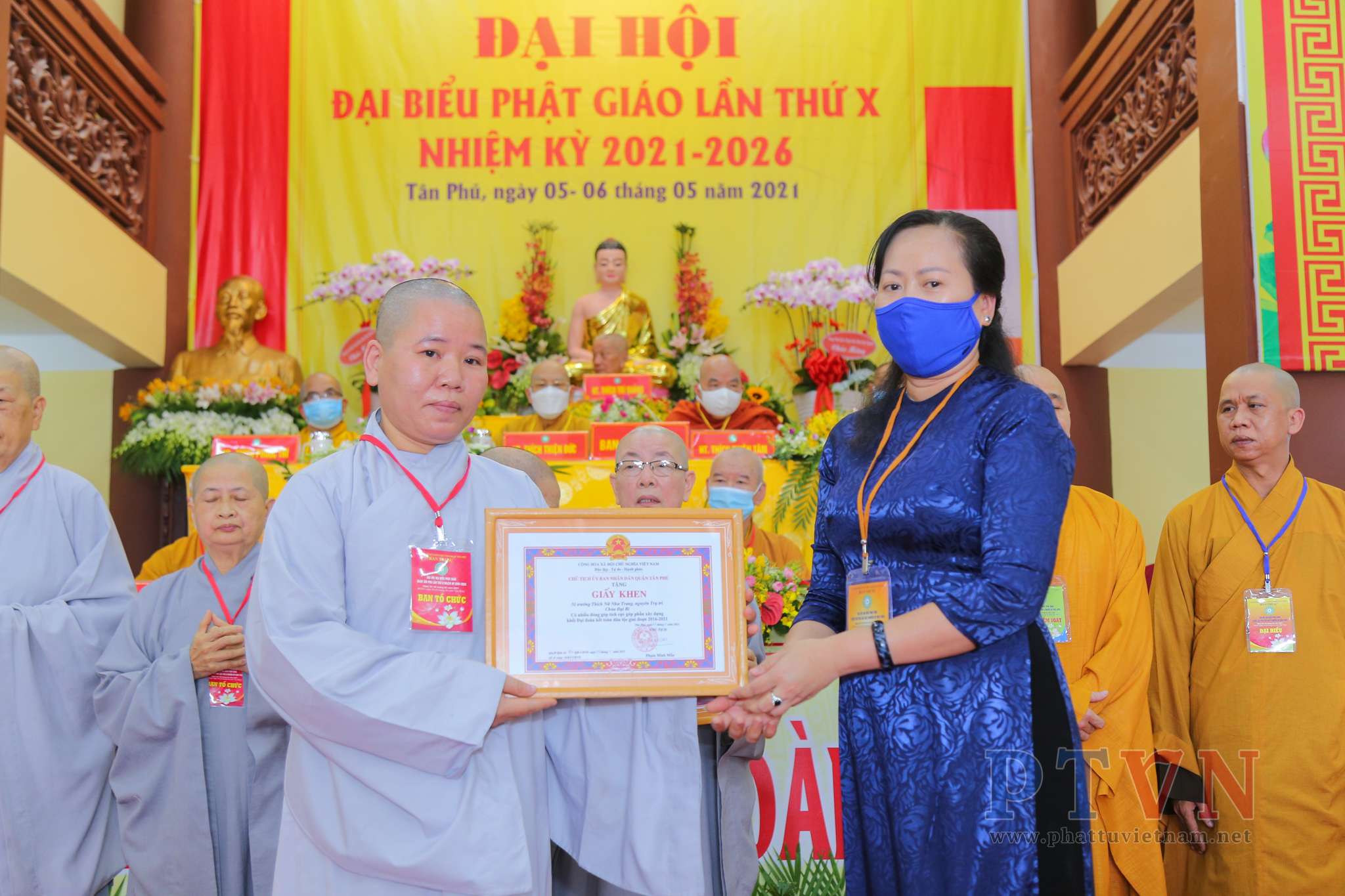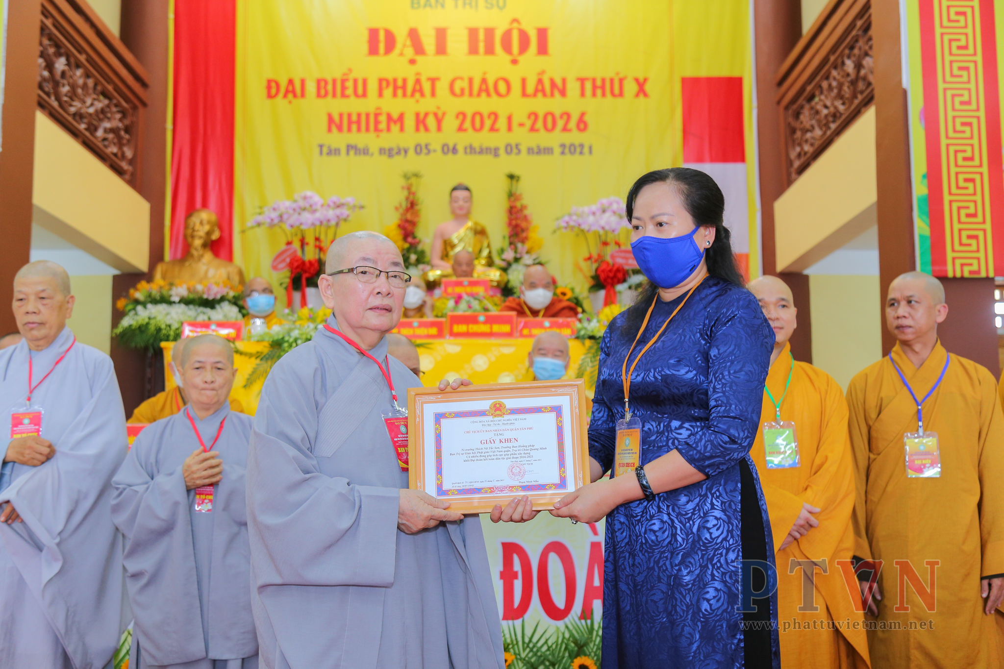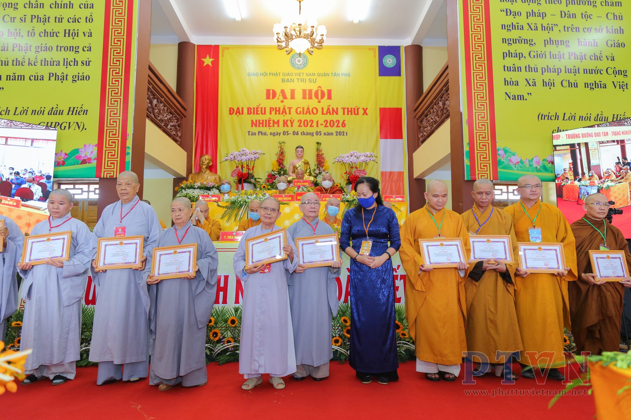 Đại diện chính quyền địa phương, bà Đặng Thị Hồng Vân – Chủ tịch UB MTTQVN quận Tân Phú trân trọng ghi nhận các thành tựu Phật sự mà GHGPVN quận Tân Phú đã đạt được trong nhiệm kỳ IX (2016 – 2021).