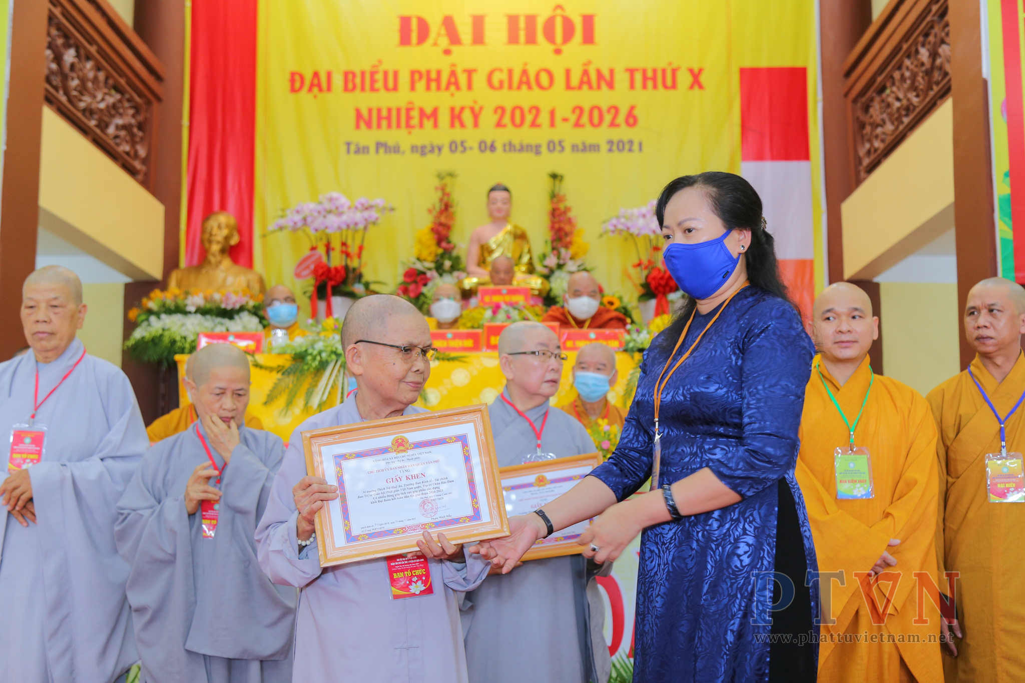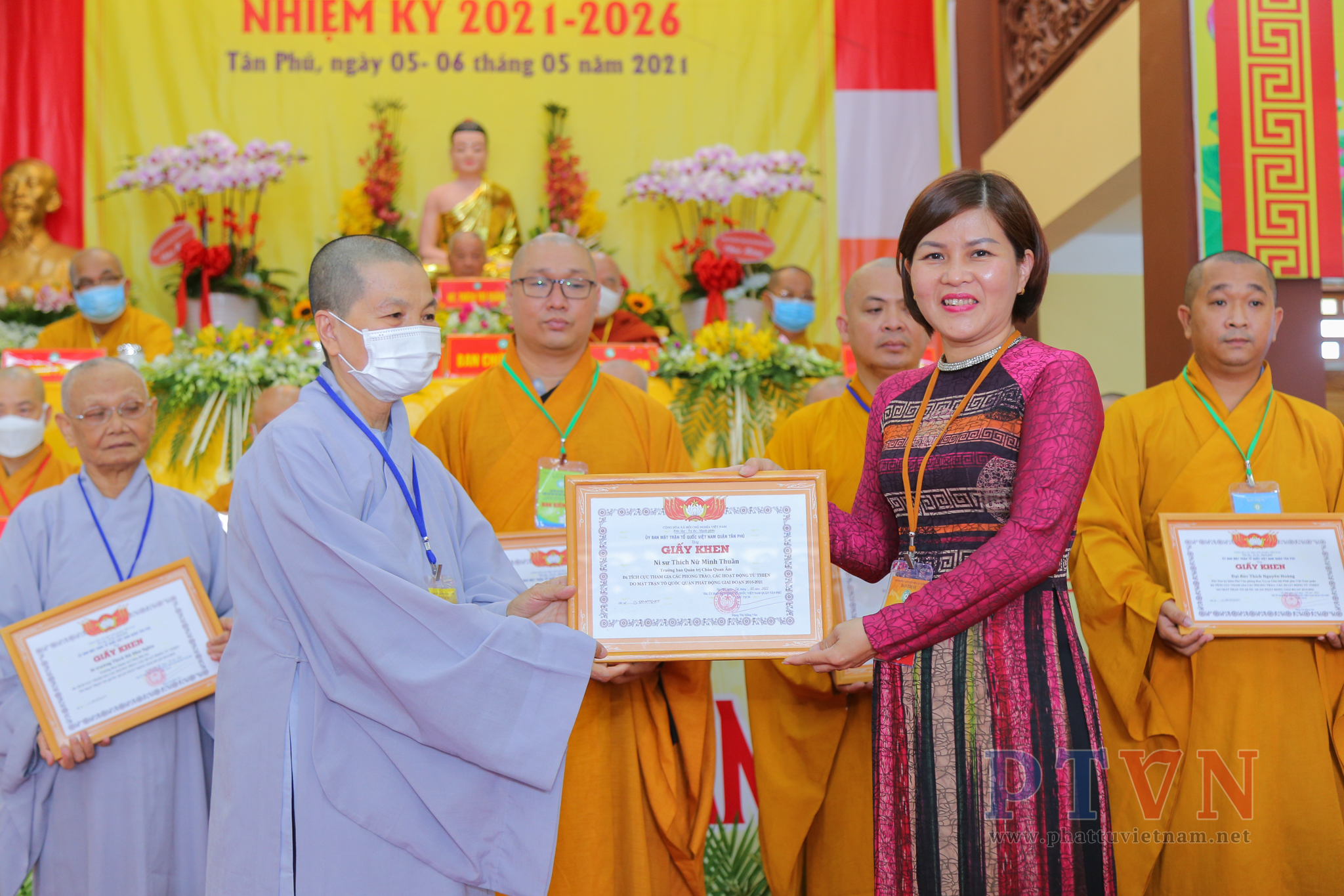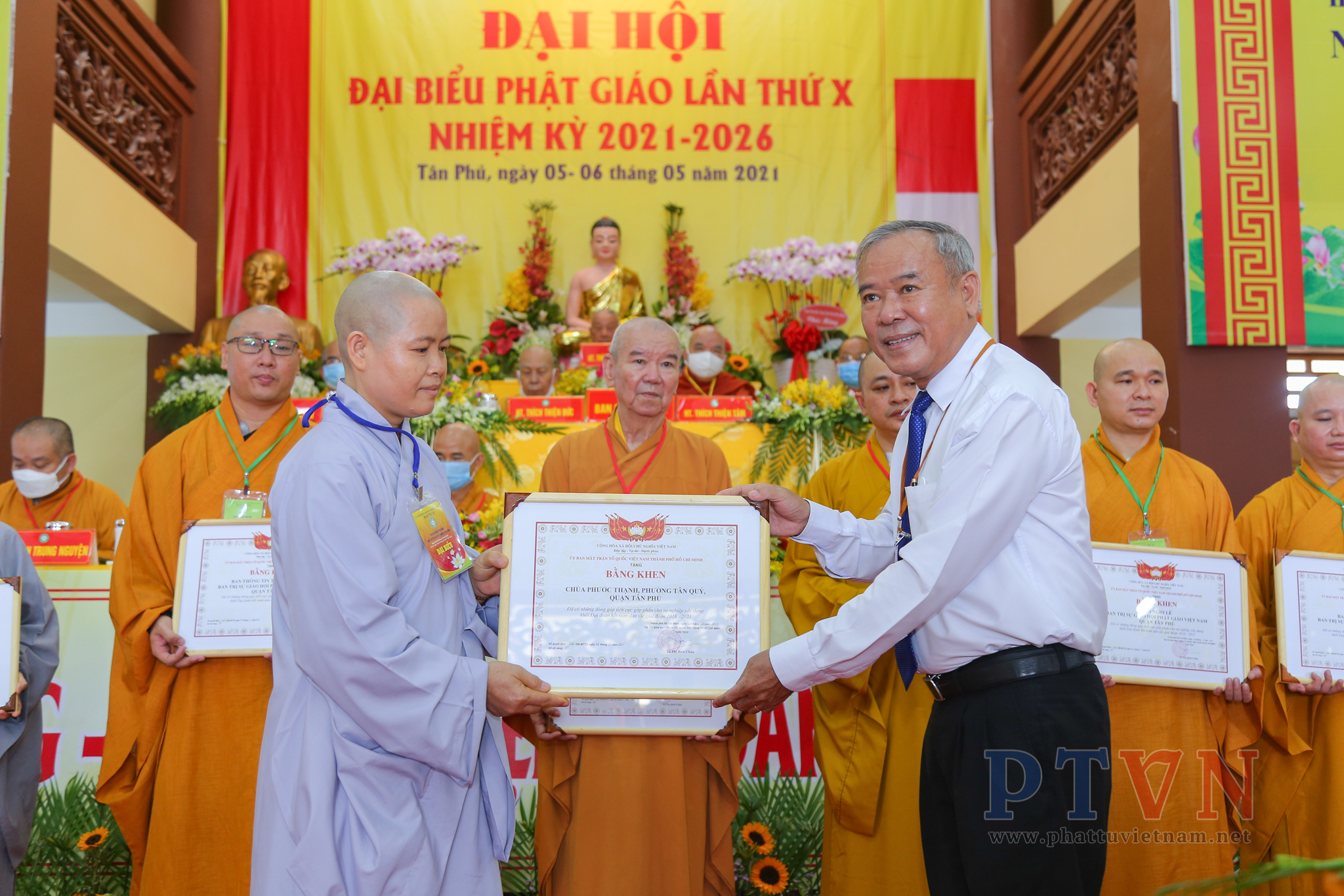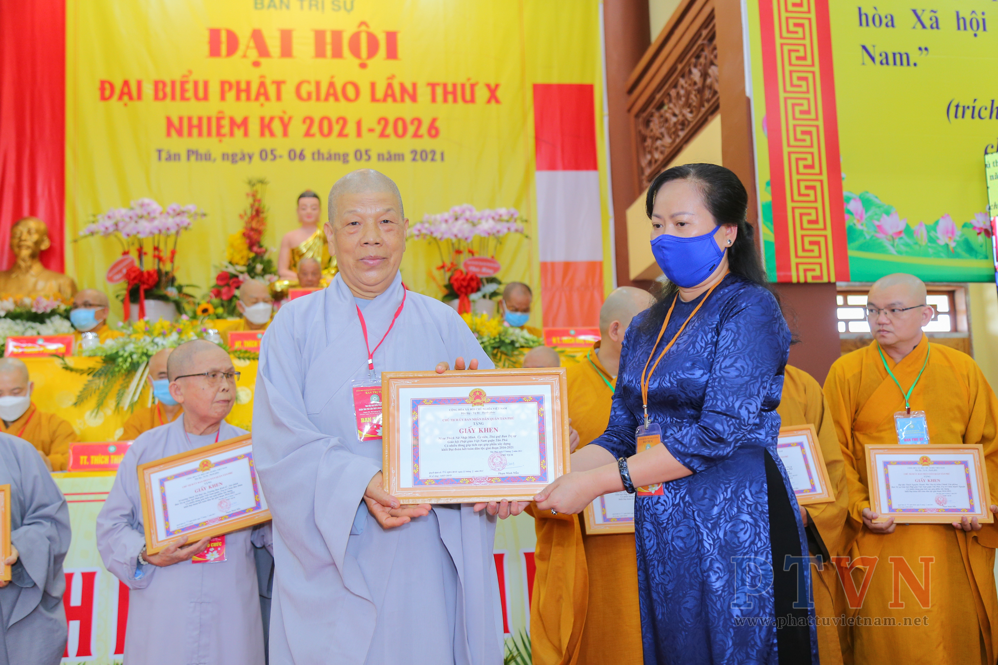Đại diện chính quyền địa phương, bà Đặng Thị Hồng Vân – Chủ tịch UB MTTQVN quận Tân Phú trân trọng ghi nhận các thành tựu Phật sự mà GHGPVN quận Tân Phú đã đạt được trong nhiệm kỳ IX (2016 – 2021).