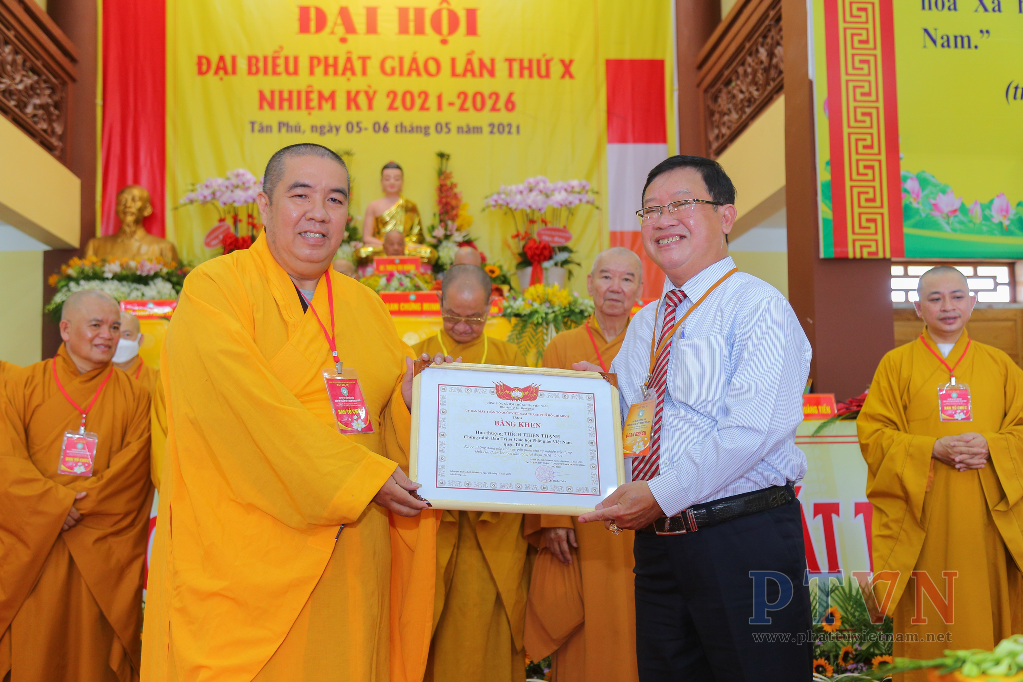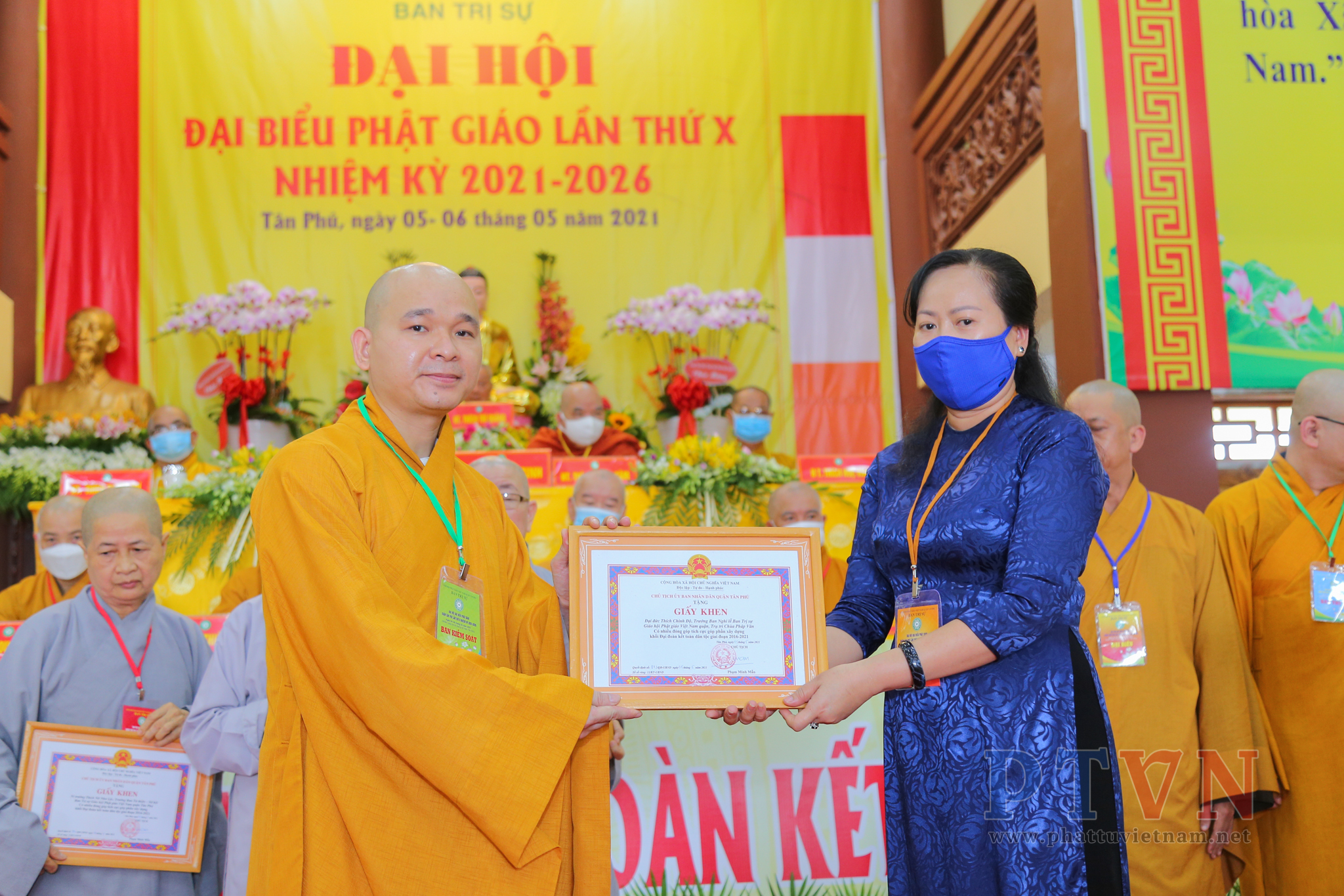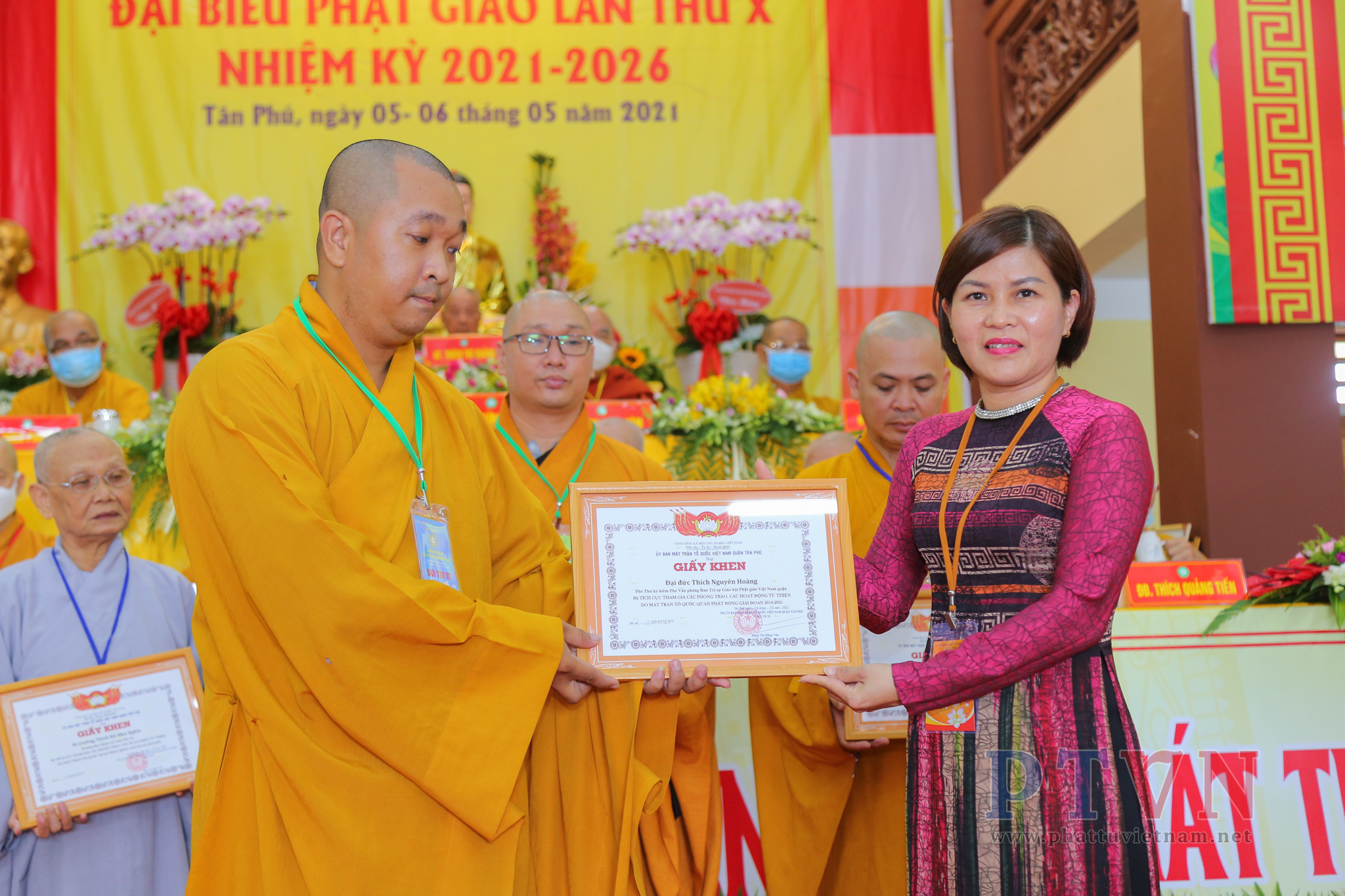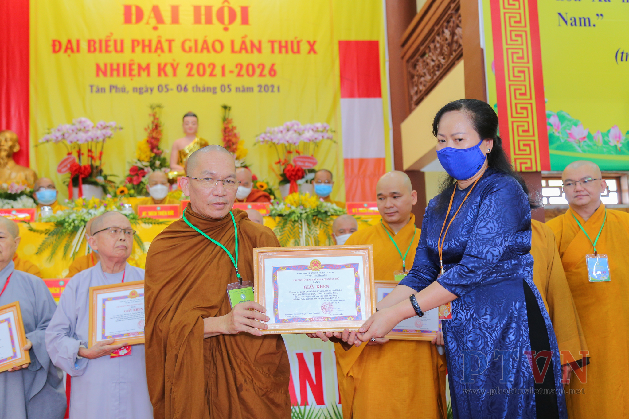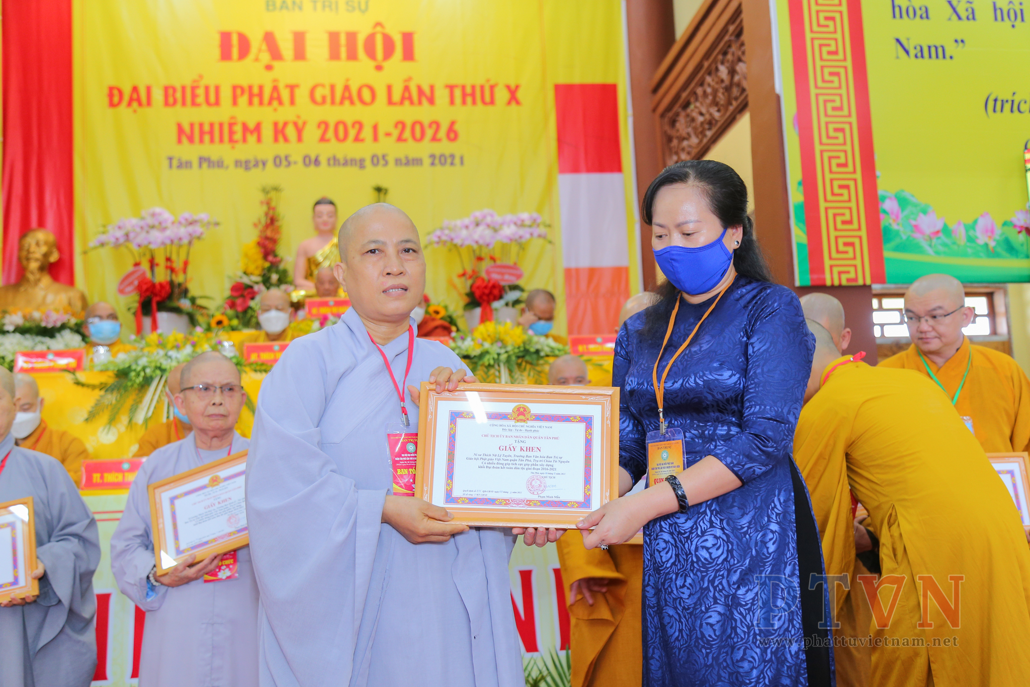 Đại diện chính quyền địa phương, bà Đặng Thị Hồng Vân – Chủ tịch UB MTTQVN quận Tân Phú trân trọng ghi nhận các thành tựu Phật sự mà GHGPVN quận Tân Phú đã đạt được trong nhiệm kỳ IX (2016 – 2021).
