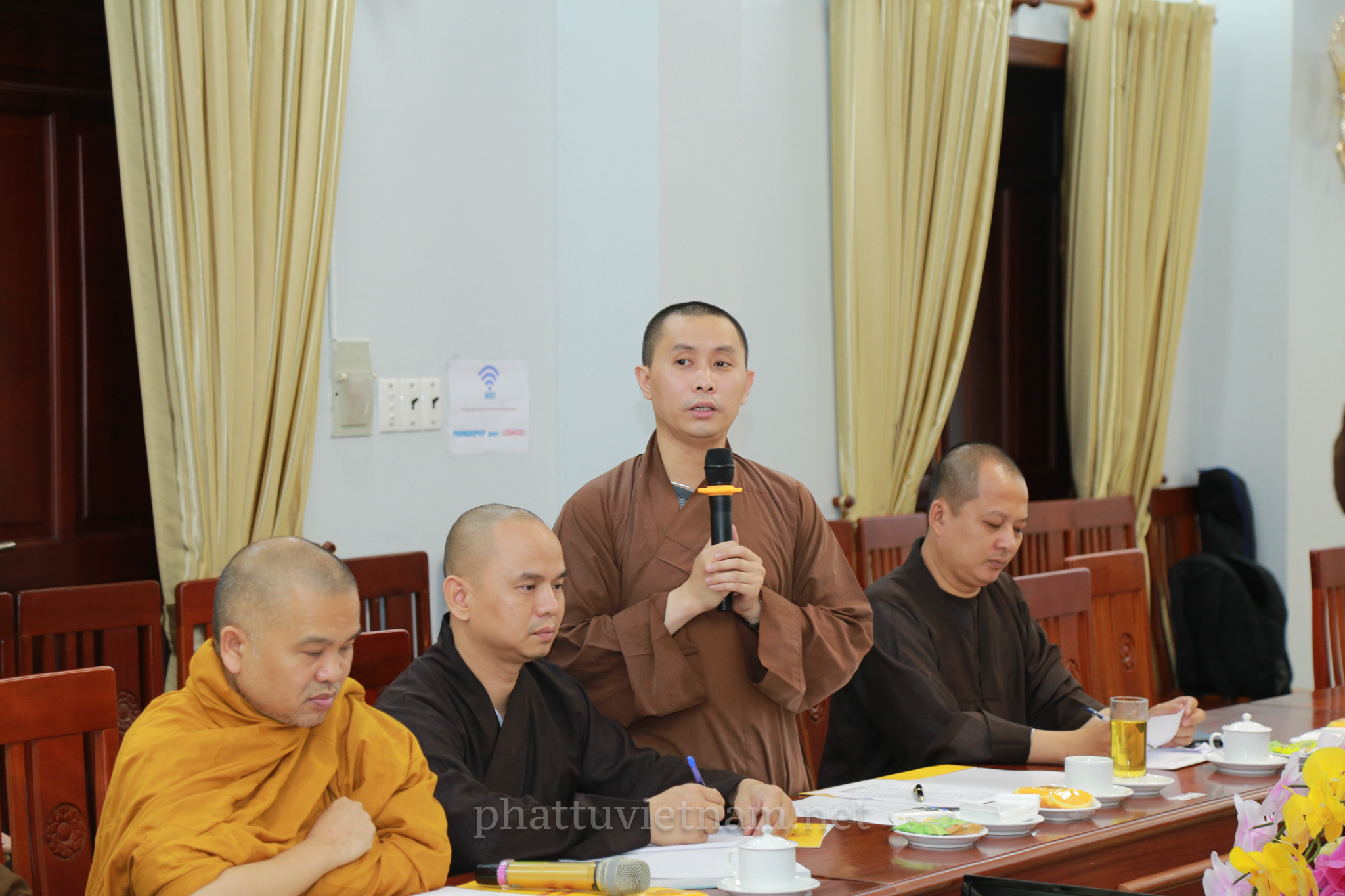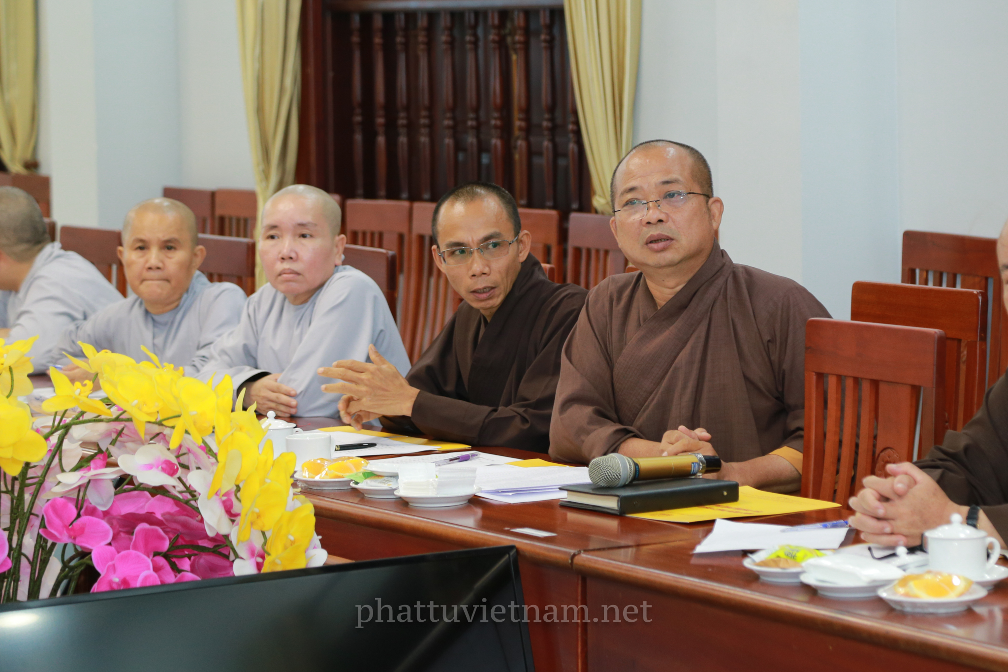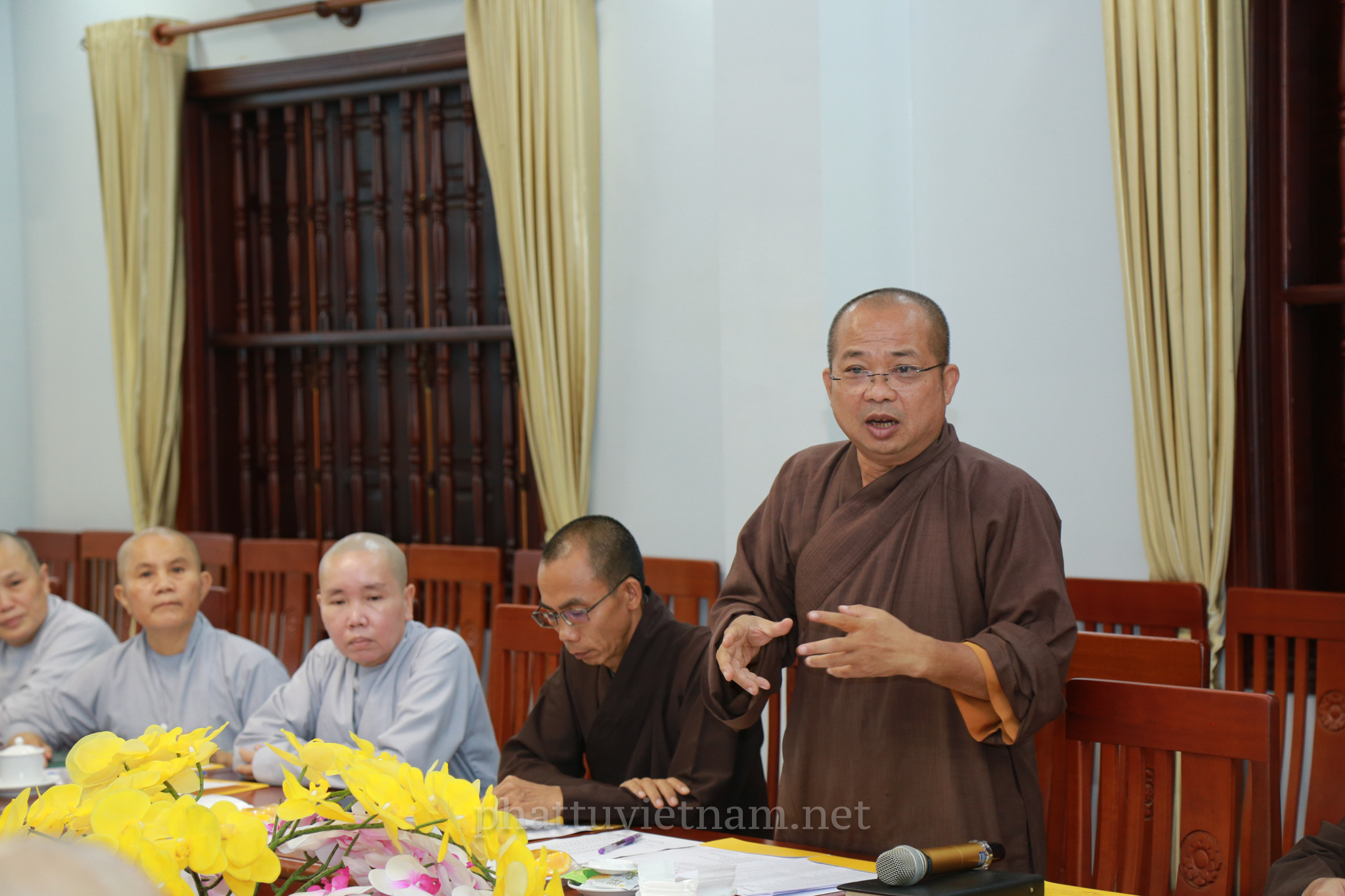 TT.Thích Quang Thạnh – Phó Viện trưởng kiêm Tổng Thư ký Học viện đã báo cáo về công tác chuẩn bị cho lễ khai mạc kỳ thi, như trang trí buổi lễ, chương trình, khách mời và chư Tôn đức Hội động điều hành và Hội đồng tuyển sinh cũng đã phát biểu đóng góp ý kiến để thống nhất.