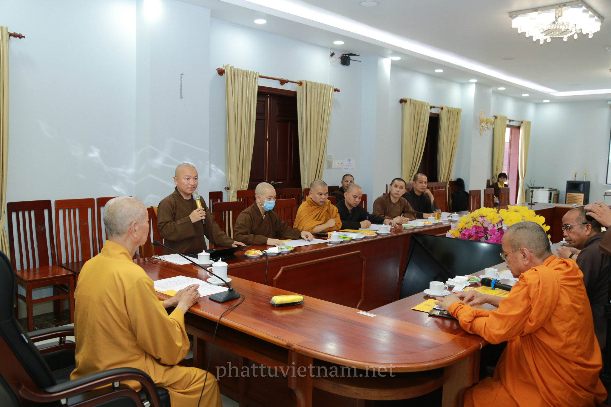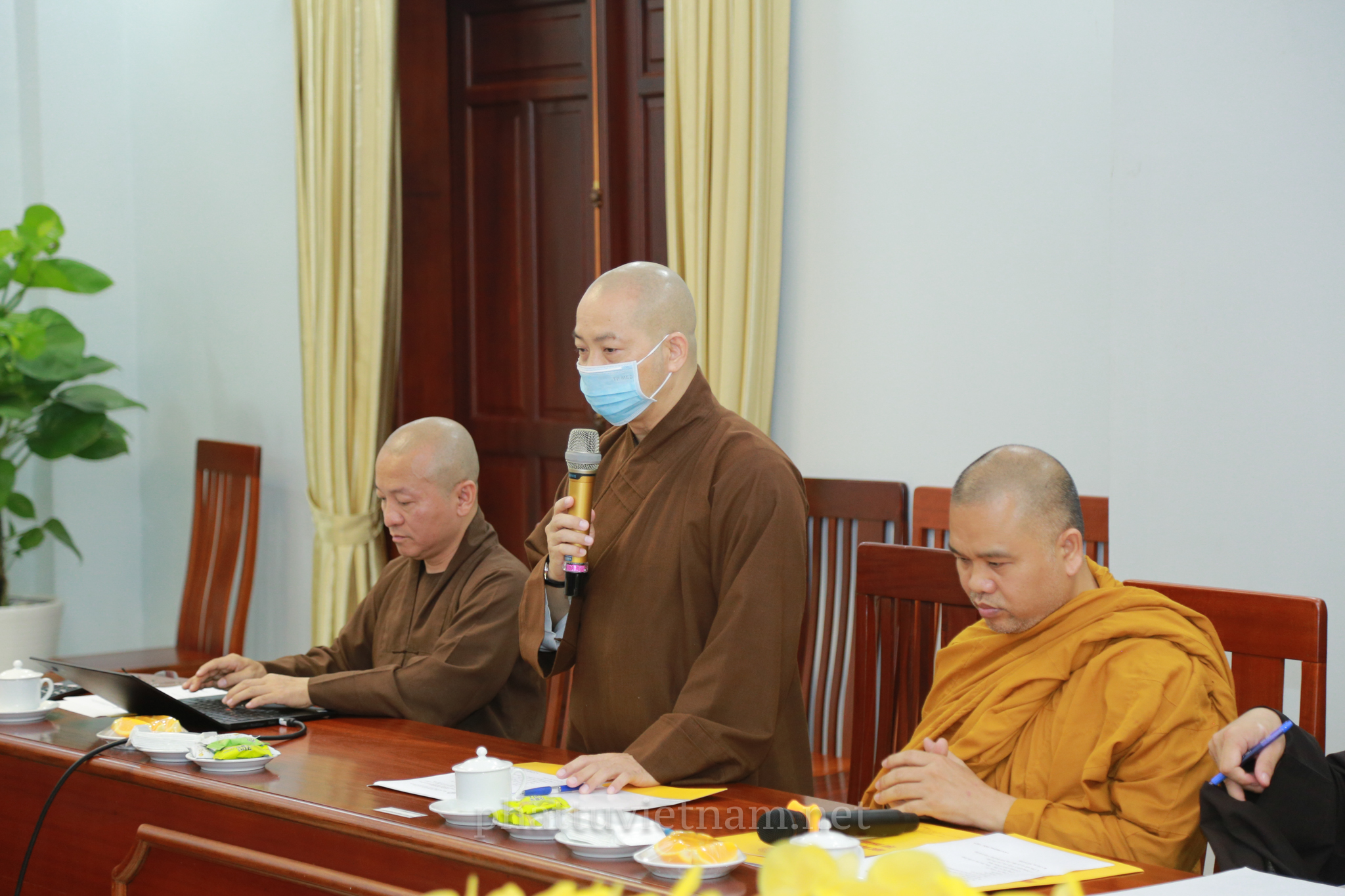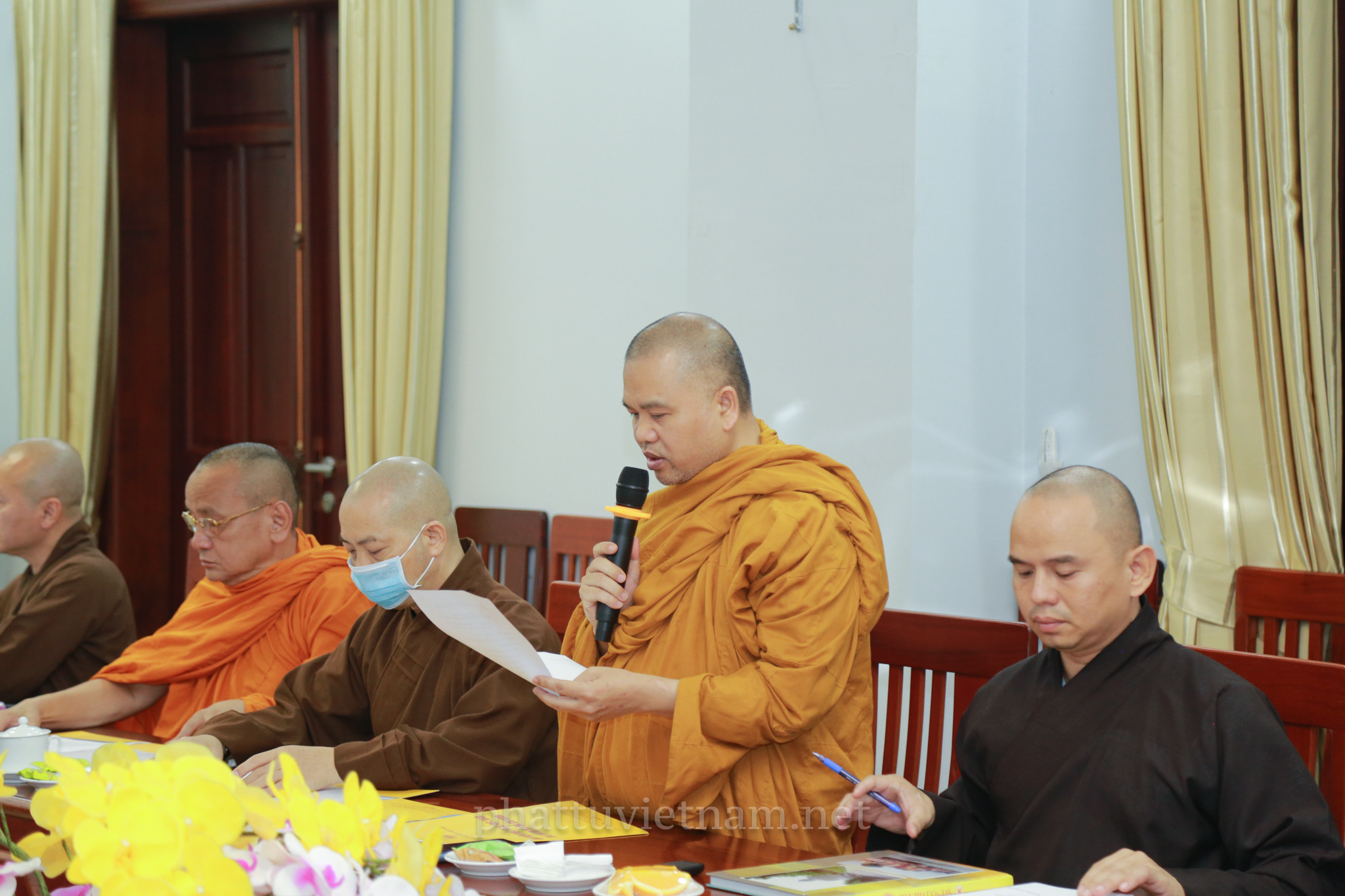 TT.Thích Quang Thạnh – Phó Viện trưởng kiêm Tổng Thư ký Học viện đã báo cáo về công tác chuẩn bị cho lễ khai mạc kỳ thi, như trang trí buổi lễ, chương trình, khách mời và chư Tôn đức Hội động điều hành và Hội đồng tuyển sinh cũng đã phát biểu đóng góp ý kiến để thống nhất.