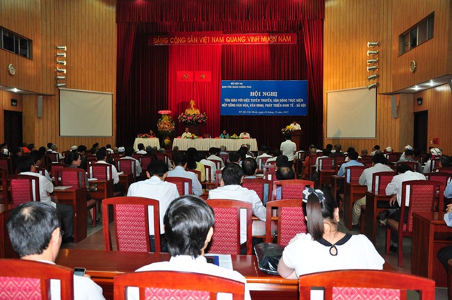 Mở đầu, ông Bùi Thanh Hà – Phó ban tôn giáo chính phủ phát biểu chào mừng và khai mạc hội nghị. Tiếp theo, ông Trần Tấn Hùng – Phó ban tôn giáo chính phủ trình bày báo cáo về tình hình và kết quả của việc tuyên truyền, vận động thực hiện nếp sống văn hoá, văn minh, phát triển kinh tế, xã hội. Ông đã nêu ra việc thực hiện nếp sống văn hoá, văn minh ở cơ sở thờ tự tôn giáo và khu dân cư, tham gia chủ trương xã hội hoá y tế, tham gia chủ trương xã hội hoá giáo dục, tham gia hoạt động từ thiện xã hội, tham gia xây dựng Đảng – chính quyền, tham gia phong trào thi đua yêu nước, phát triển kinh tế xã hội.