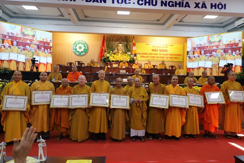 TT. Thích Minh Nhẫn – Ủy viên Thư ký HĐTS, Phó chánh Văn phòng 2 TƯ GHPGVN tuyên đọc Quyết định trao bằng tuyên dương công đức của GHPGVN đến 15 tập thể và 27 cá nhân của Ban HDPT TƯ đã có nhiều đóng góp tích cực cho công tác hoạt động Phật sự của Ban HDPT TƯ năm 2023.