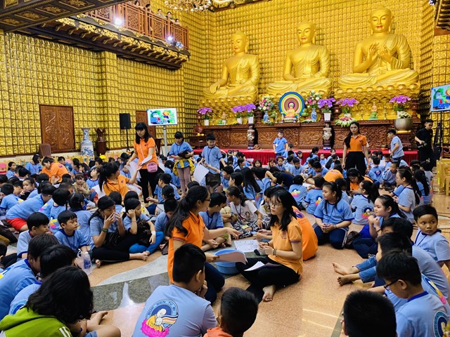 Chiều 27/7/2019, tại Chùa Giác Ngộ, Q10, TP. HCM, khóa tu Búp Sen Từ Bi theo định kỳ hằng tuần được diễn ra với nhiều tiết mục hướng về mùa Vu-lan báo hiếu PL. 2563, DL. 2019. Đến với kỳ tu học này, ê-kíp Ban tổ chức (Đội ngũ Phụng sự viên Chùa Giác Ngộ) đón tiếp hơn 200 trong độ tuổi 5 – 14 tại chánh điện (lầu 1) và thiền đường (lầu 3).