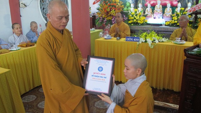 Theo đó, được sự chấp thuận của Thường trực BTS GHPGVN TP.HCM. Nhân lể giỗ lần thứ 3 cố Ni sư Thích nữ Như Châu – Nguyên Trụ trì chùa Giác Huệ. Ban Trị sư Phật giáo H. Hóc Môn đã phối hợp cùng Bổn tự đã long trọng tổ chức Lễ Trao quyết định bổ nhiệm Trụ trì Chùa Giác Huệ cho sư cô Thích nữ Huệ Thái, trưởng tử của cố Ni sư, tại số 25/4 đường Lê Lợi, Thị trấn Hóc Môn, TP.HCM để ổn định về tư cách pháp lý, pháp nhân nhằm ổn định sinh hoạt và tu học cho chư Ni và quần chúng Phật tử tại địa phương.