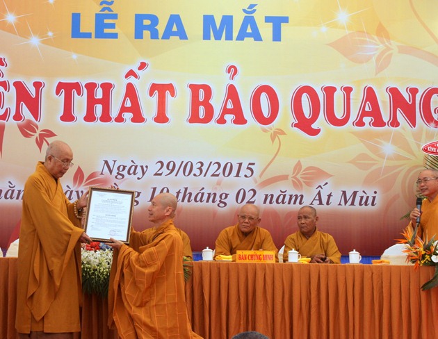 Tiếp theo, TT Thích Quảng Tánh – Phó Thường trực BTS GHPGVN huyện Củ Chi thừa uỷ nhiệm Thường trực BTS PG TP.HCM tuyên đọc quyết định công nhận Thiền thất Bảo Quang là cơ sở tôn giáo chính thức trực thuộc GHPGVN. Theo đó, TT Thích Chân Quang có trách nhiệm dẫn dắt, tổ chức sinh hoạt tu học, quản lí cơ sở thực hiện đúng chủ trương, chính sách, pháp luật của nhà nước, đúng hiến chương GHPGVN đối với một cơ sở tôn giáo tại địa phương.