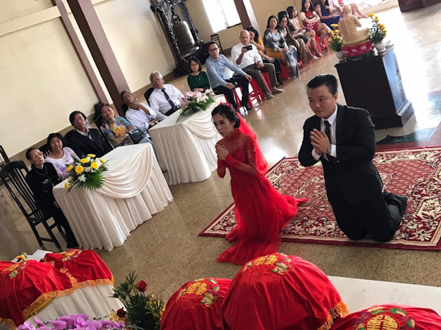 Tại buổi lễ, dưới sự hướng dẫn của Đại đức chủ lễ, Tân Lang và Tân Nương đầu tiên dâng hương lễ bái Tam Bảo. Sau đó, cả 2 lễ vái nhau để bày tỏ cho tấm lòng kính trọng, thương yêu, che chỡ lẫn nhau trong đời sống vợ chồng sau này, điều đó thể hiện sâu lắng hơn qua lời phát nguyện của 2 vợ chồng .