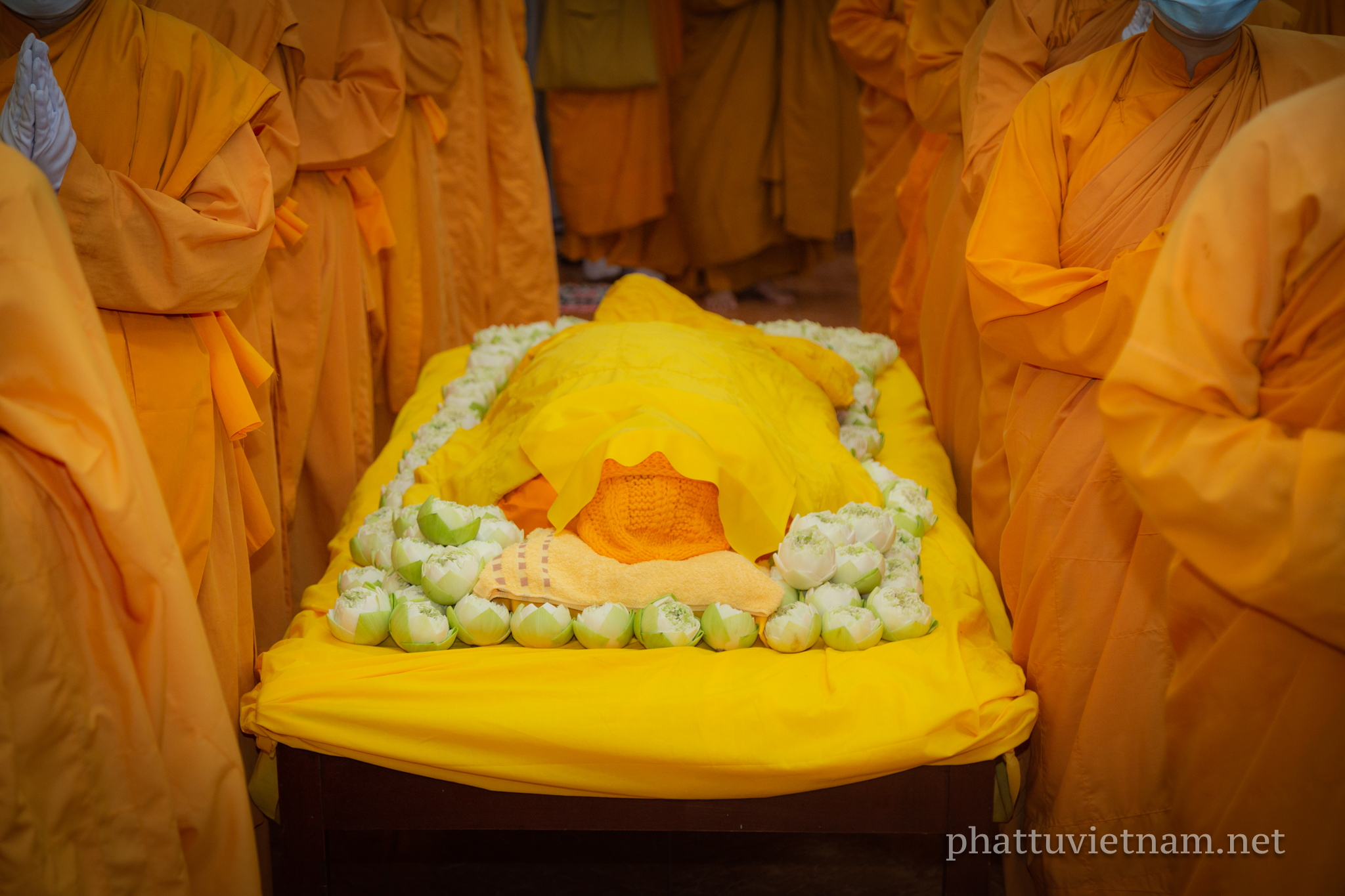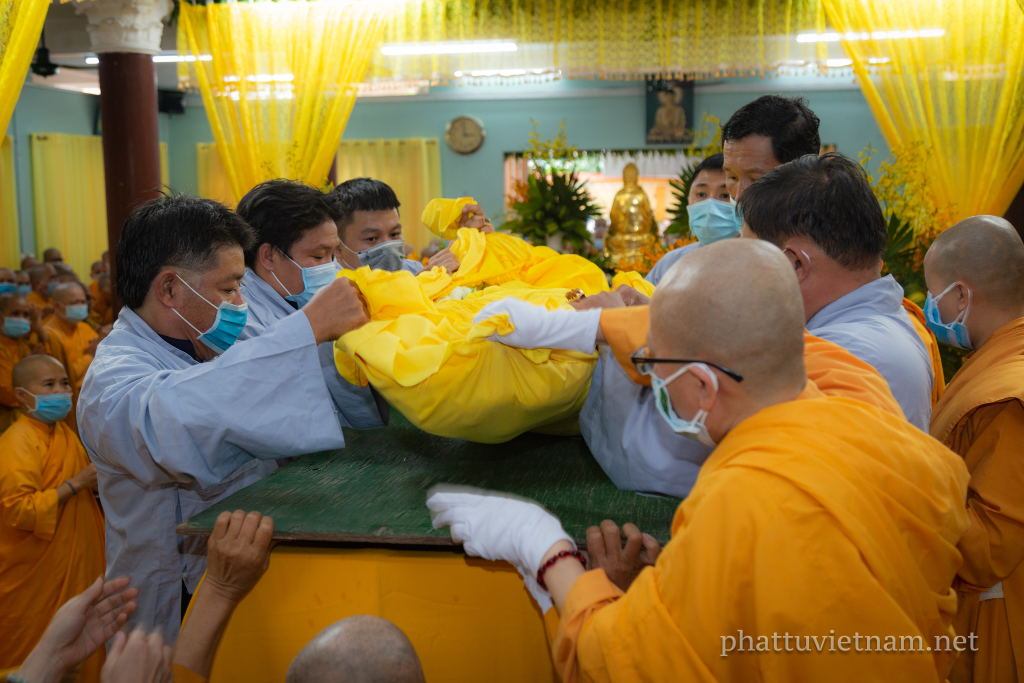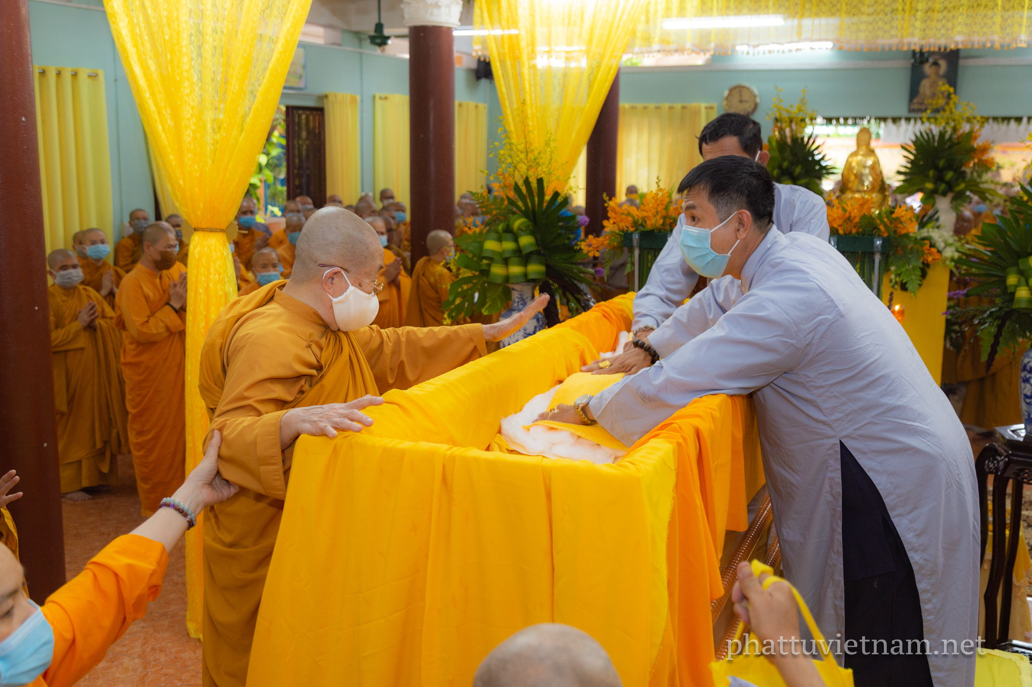 Sau nghi thức sái tịnh của chư Hoà thượng chứng minh, môn đồ đệ tử đã cung thỉnh nhục thân Ni trưởng nhập kim quan trong không khí trang nghiêm đồng hướng về cầu nguyện Giác linh Ni trưởng cao đăng Phật quốc.