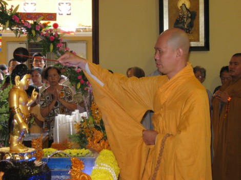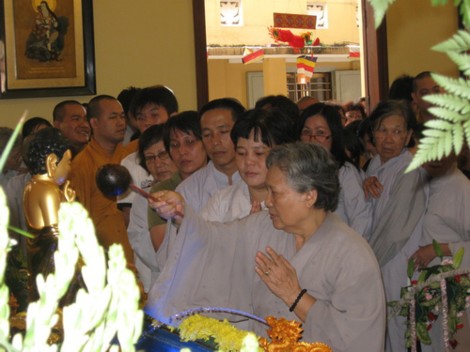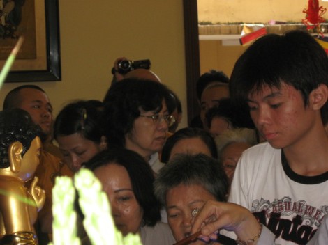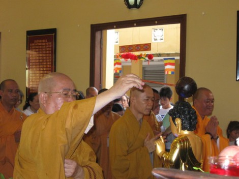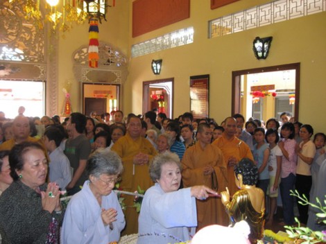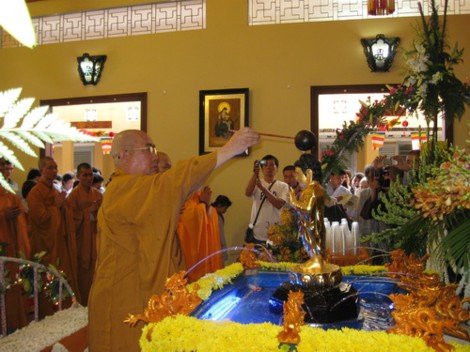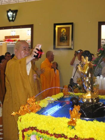 Hòa thượng Thích Nhật Quang – Trụ trì Tổ đình Ấn Quang thực hiện nghi thức tắm Phật