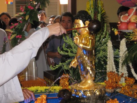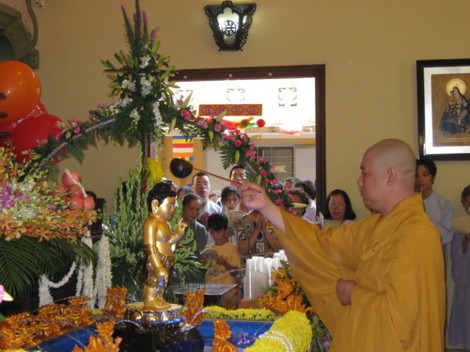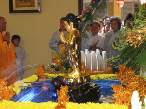 Buổi lễ bắt đầu với nghi thức sái tịnh, dâng hoa lên kim thân lên tôn tượng kinh thân Đức Phật đản sinh dưới sự cử hành nghi thức của HT. Thich Nhật Quang – Phó BTS kiêm chánh thư ký BTS Phật giáo TP.HCM – trụ trì Tổ đình Ấn Quang.