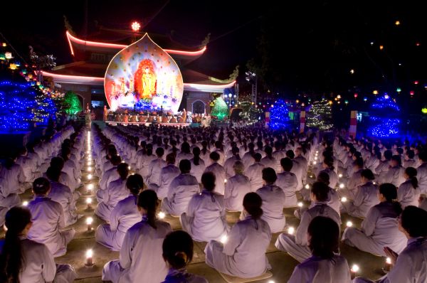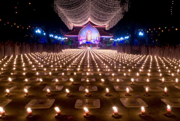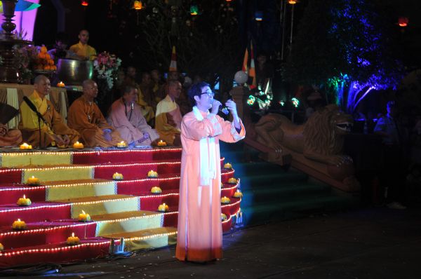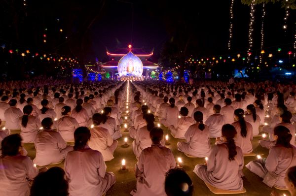 Dưới bầu trời muôn triệu vì sao lấp lánh, ánh sáng lung linh của ngàn ngọn nến, hòa quyện trong khói trầm lan tỏa, đã tạo nên một vùng trời bình yên, thanh tịnh và an lành nơi cõi nhân gian. Trong sự thành kính, hàng ngàn người con Phật đối trước tôn ảnh uy nghiêm thanh thoát, lắng nghe Thượng tọa trụ trì tuyên đọc 48 đại nguyện của đức từ phụ A Di Đà, và cùng phát 12 lời nguyện niệm Phật.