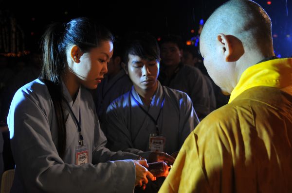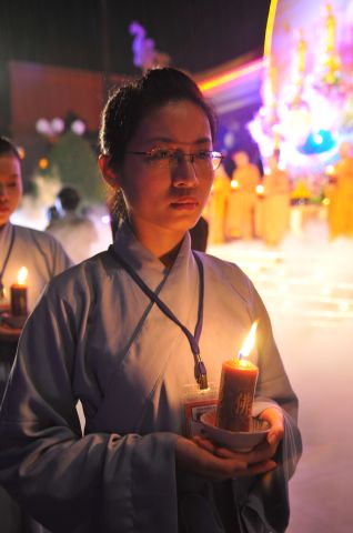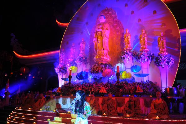 Trong nhạc điệu thiêng liêng, giây phút được đợi chờ nhất, ấn tượng nhất của đêm hội là nghi thức truyền đăng nơi tôn ảnh Phật A Di Đà. Ánh sáng lung linh từ ngọn nến trên tay Thượng tọa trụ trì bắt đầu lan tỏa đến chư tôn đức và hàng Phật tử như ánh sáng của trí tuệ, chiếu soi vào dòng đời, phá tan màn vô minh si ám, thắp sáng niềm tin và sự hy vọng.