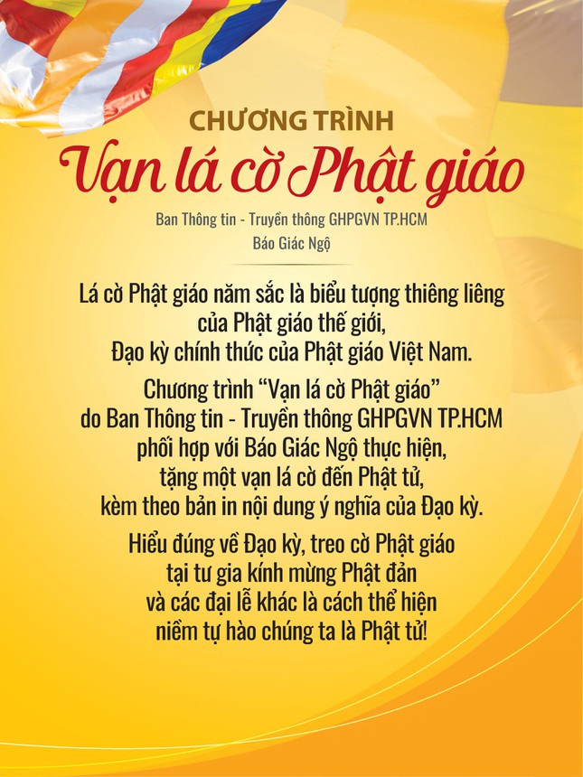 Bạn đọc, Phật tử muốn nhận cờ tặng riêng lẻ để treo trong mùa Phật đản, nếu tiện đường có thể đến tòa soạn Báo Giác Ngộ (85 Nguyễn Đình Chiểu, phường Võ Thị Sáu, quận 3) để nhận cờ tặng, từ ngày có bản tin này đến ngày 12 tháng Tư Âm lịch (23-5-2021).