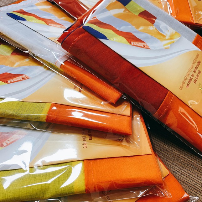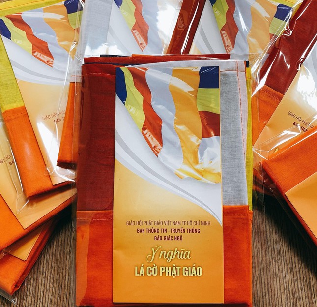 “Vạn lá cờ Phật giáo” được sự tham gia tùy hỷ của chư tôn đức, các thành viên Ban Thông tin – Truyền thông và Phật tử, số lượng thực hiện trong dịp này 10.000 lá, chất liệu vải kete, khổ 90x60cm, đính kèm bản in ý nghĩa lá cờ Phật giáo.
