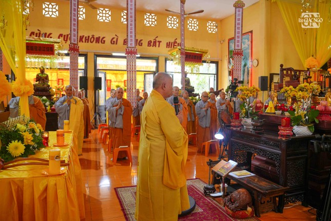 Theo đó, chư tôn đức Hòa thượng Ban chức sự quang lâm chánh điện niệm hương bạch Phật. Hòa thượng Thích Huệ Cảnh tiến hành thực hiện nghi thức khai chung bảng, thượng phan và an linh đàn tràng.