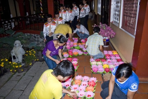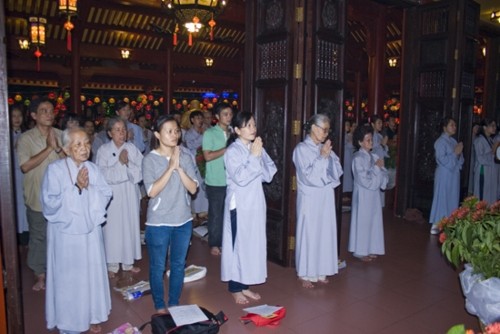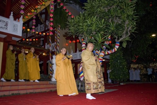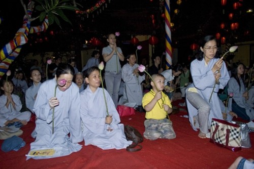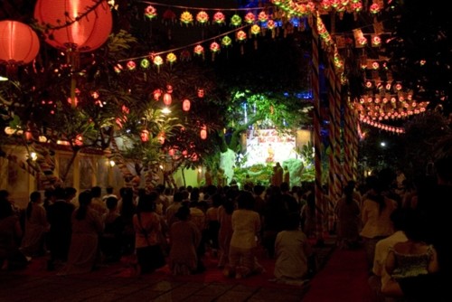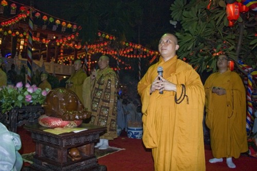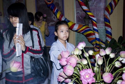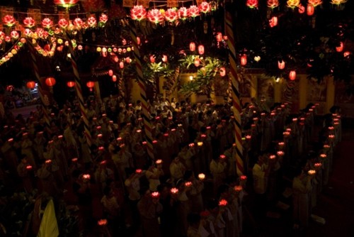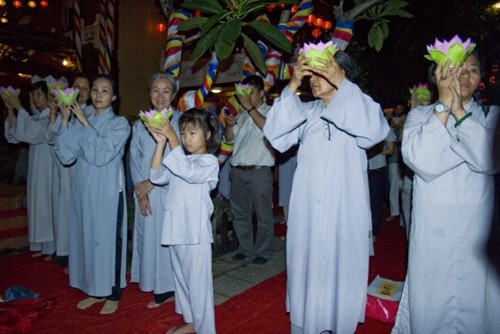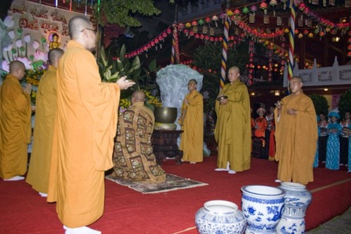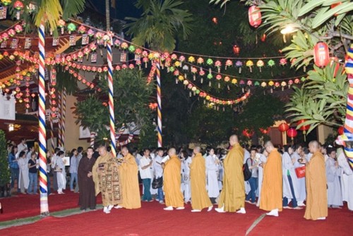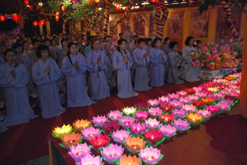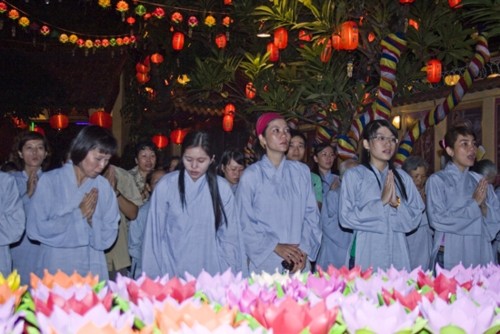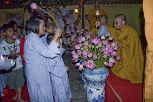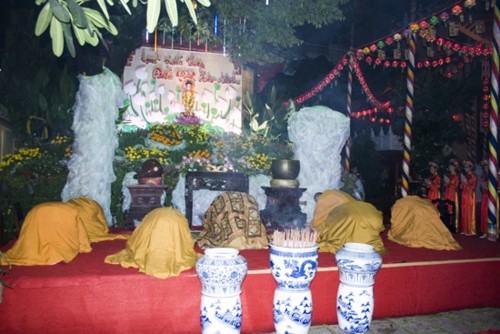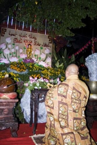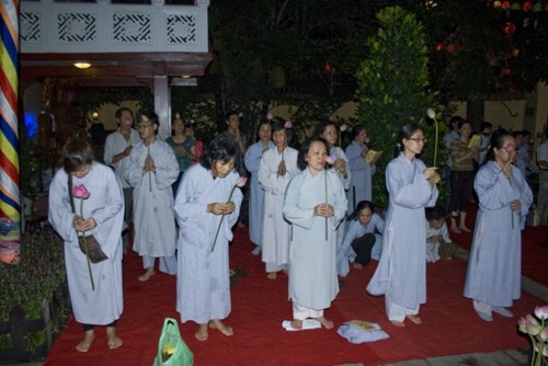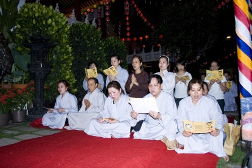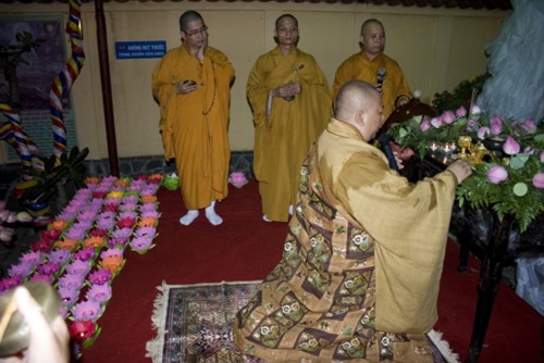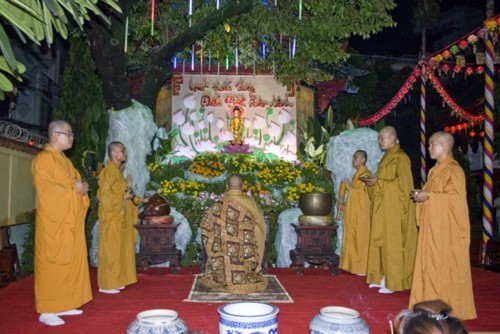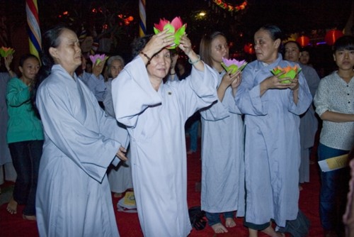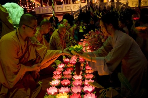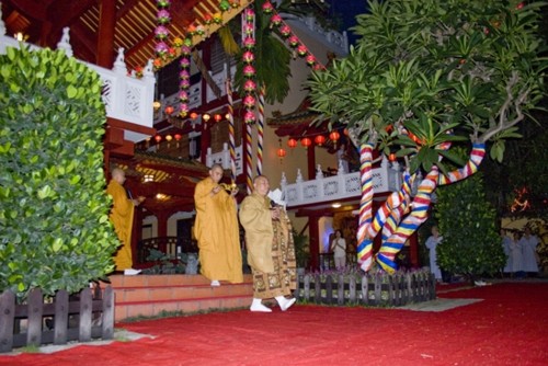 Tiếp theo, trong ánh sáng lung linh huyền diệu, chư tăng và phật tử tại đạo tràng đã thắp hoa đăng cúng dường lên Đức Phật nguyện cầu nguyện thế giới hòa bình, chúng sinh an lạc.