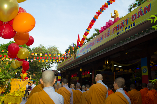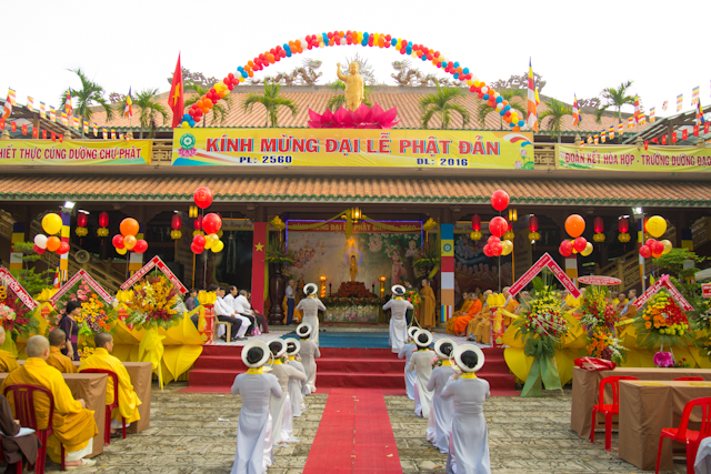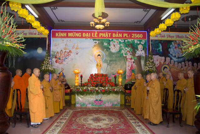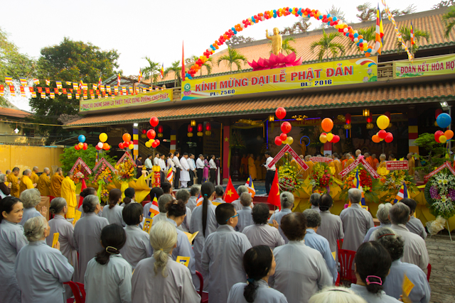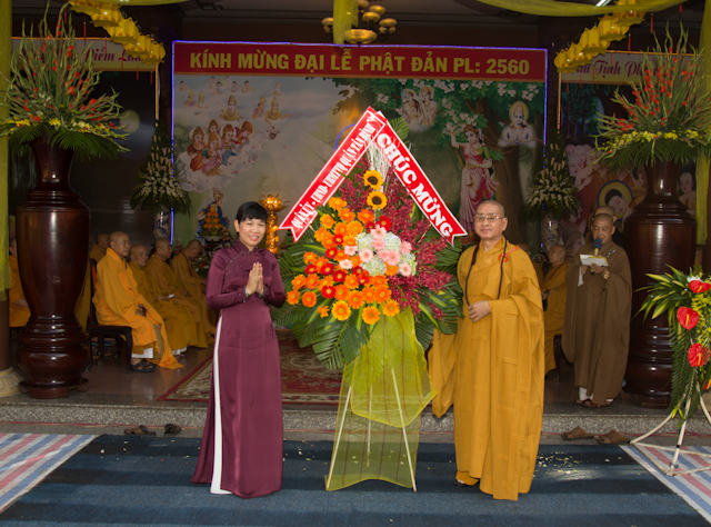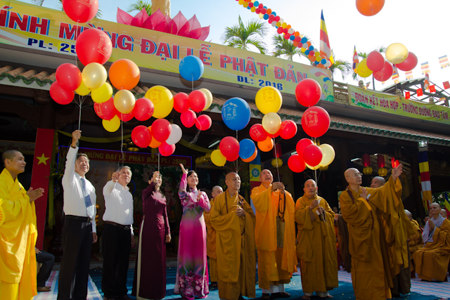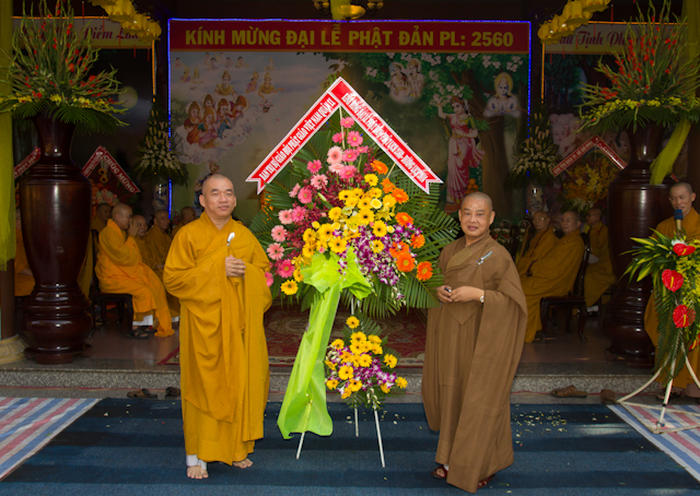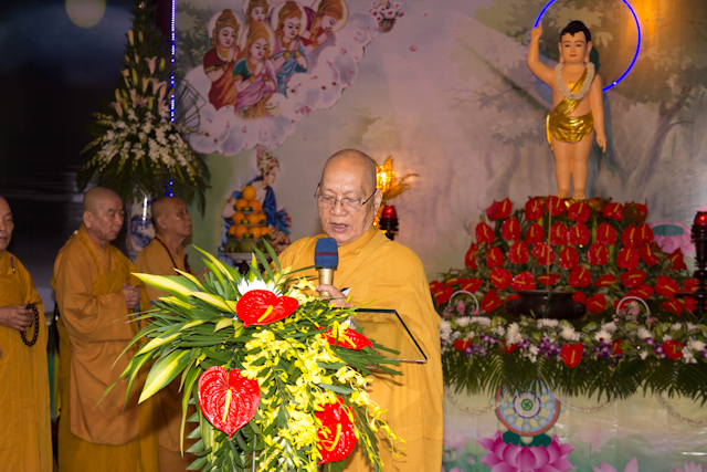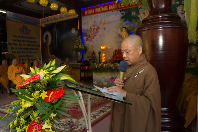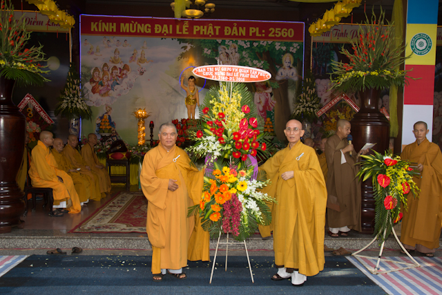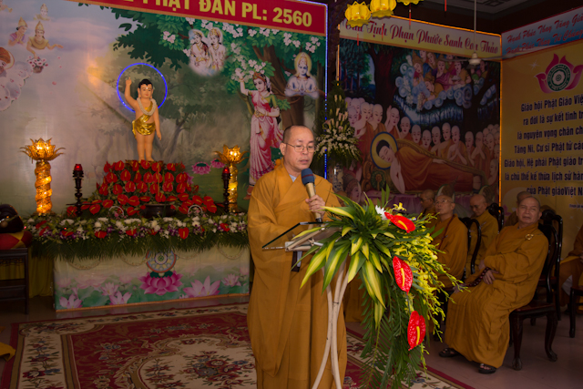 Tiếp theo, TT.Thích Đạt Đức tuyên đọc diễn văn khai mạc Phật đản Pl:2560 – D:2016 của Hòa thượng chủ tịch HĐTS. Sau đó, Chư tôn hòa thượng chứng minh dâng hương bạch Phật, Tăng Ni Phật tử cùng nhau tụng kinh Khánh Đản và thả bong bóng  hòa bình.