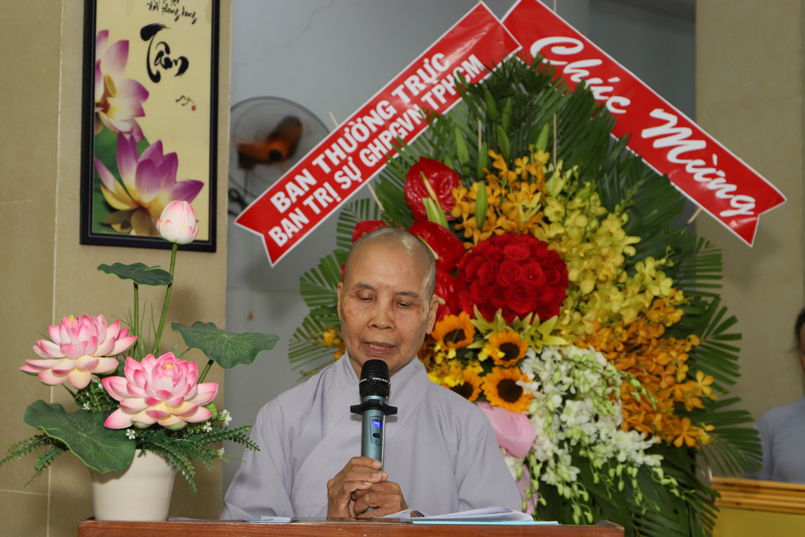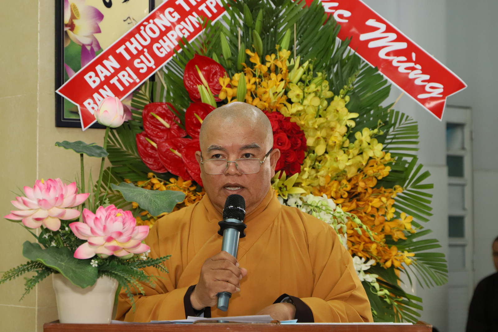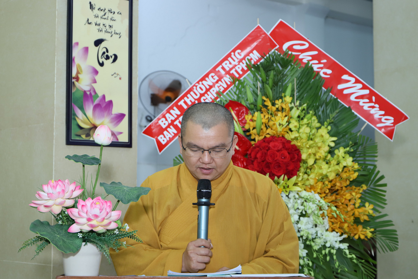 Mở đầu buổi lễ, TT. Thích Thiện Hòa – Phó Trưởng ban Thường trực BTS GHPGVN Q. Tân Phú phát biểu: Năm 2019 đã khép lại, nhìn lại những hoạt động Phật sự của BTS GHPGVN Q. Tân Phú trong năm qua, chúng ta đã thấy được những hoạt động nổi bậc, trong đó có những hoạt động mang đặc tính riêng của từng Tự viện, đó là sự đóng góp công sức của tập thể Tăng ni, Phật tử Q. Tân Phú, thể hiện tinh thần đoàn kết hòa hợp, phụng sự nhân sinh.