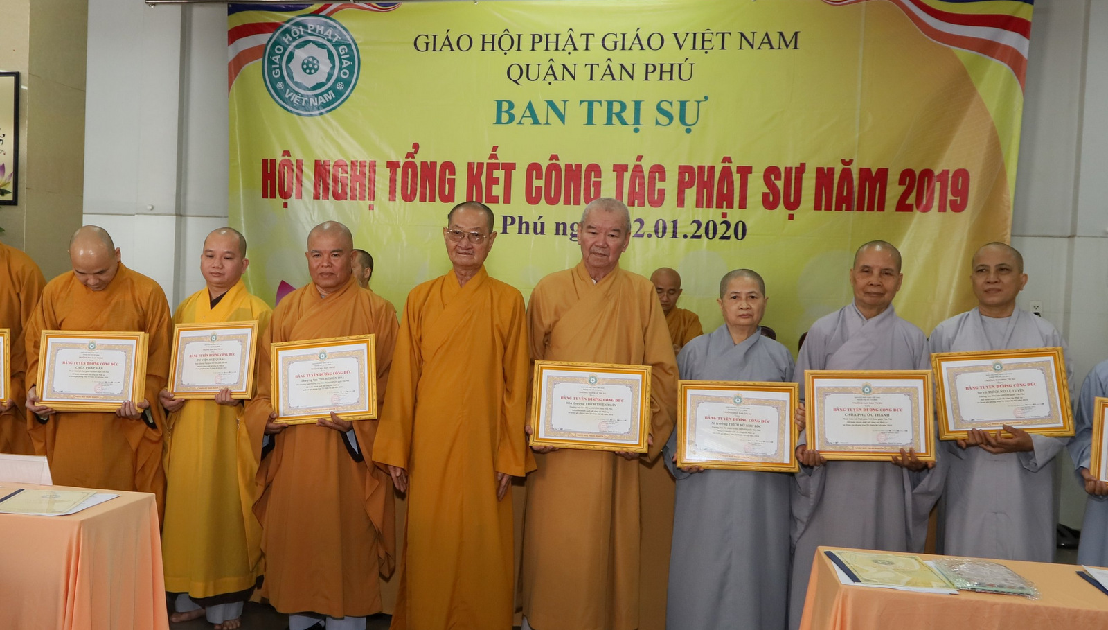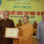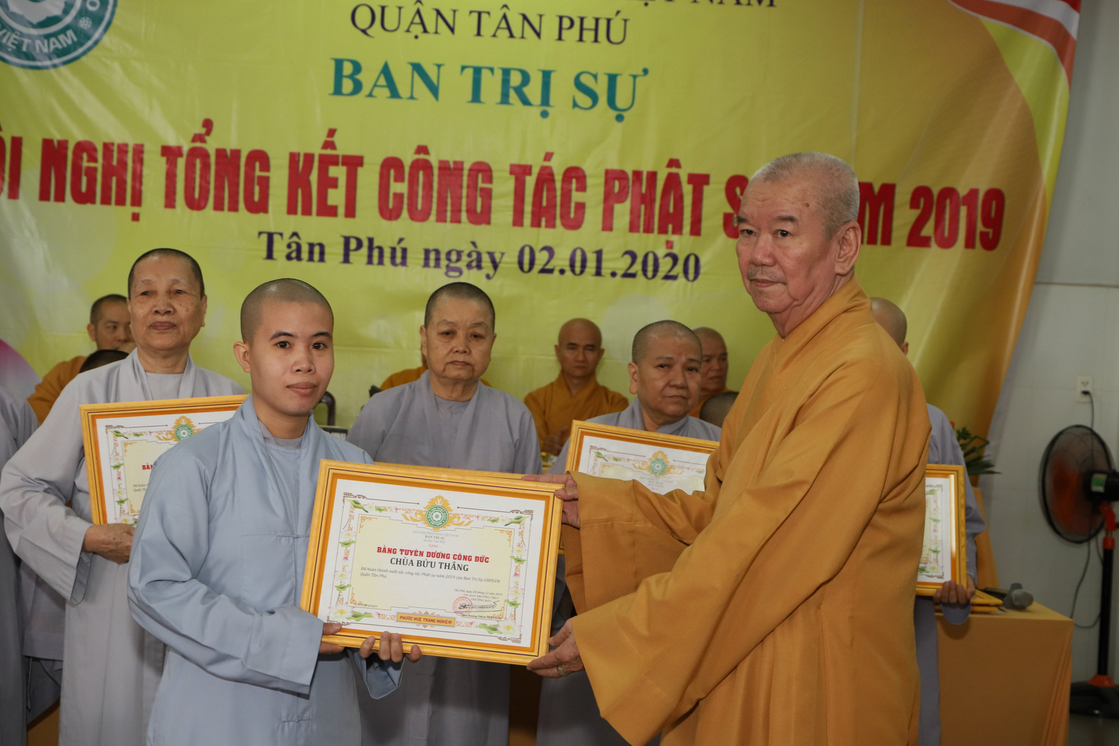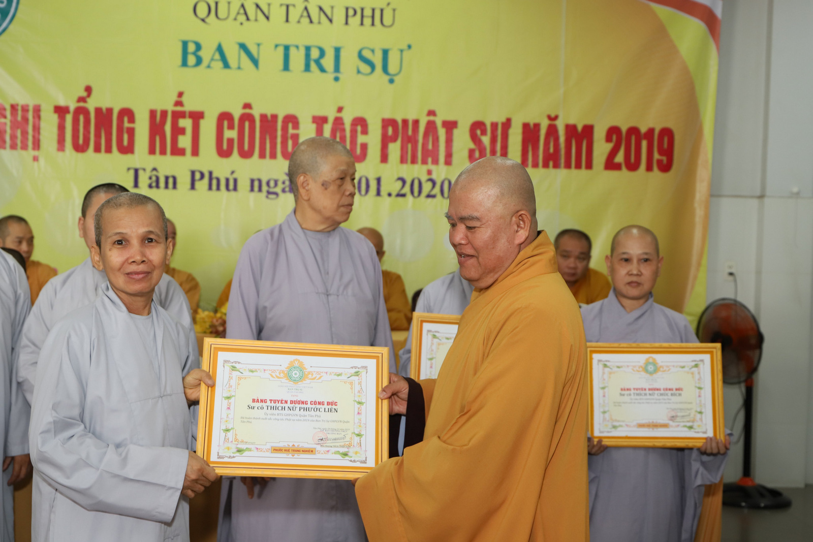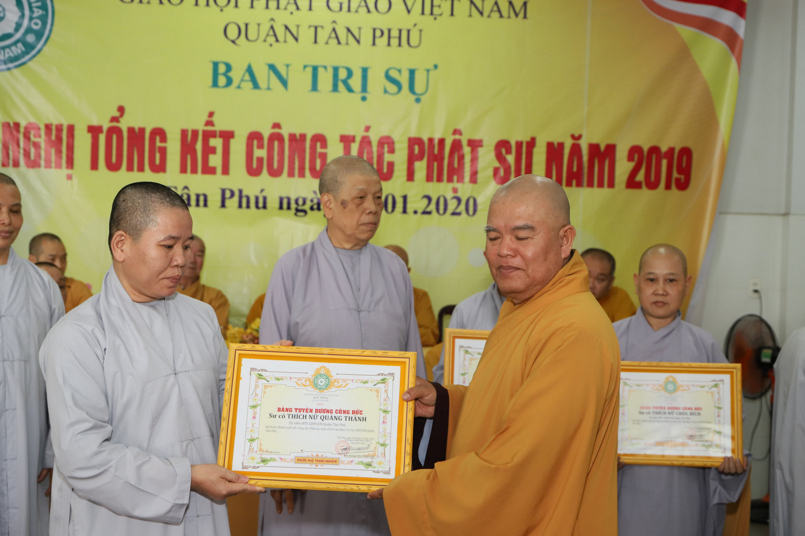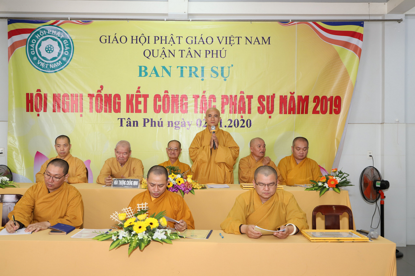 Kết thúc buổi lễ, TT. Thích Thiện Quý – Phó trưởng ban kiêm Chánh thư ký BTS GHPGVN TPHCM tán tán, ghi nhận những thành tựu đã đạt được của chư tôn đức BTS GHPGVN Q. Tân Phú, đồng thời tri ân đến các cấp chính quyền địa phương đã hỗ trợ cho BTS PG Q. Tân Phú trong mọi hoạt động Phật sự đã đề ra.  Thượng tọa hy vọng trong năm 2020, BTS GHPGVN Q. Tân Phú tiếp tục phát huy vai trò, trách nhiệm của mình hoàn thành tốt các kết hoạch Phật sự đã đề ra.