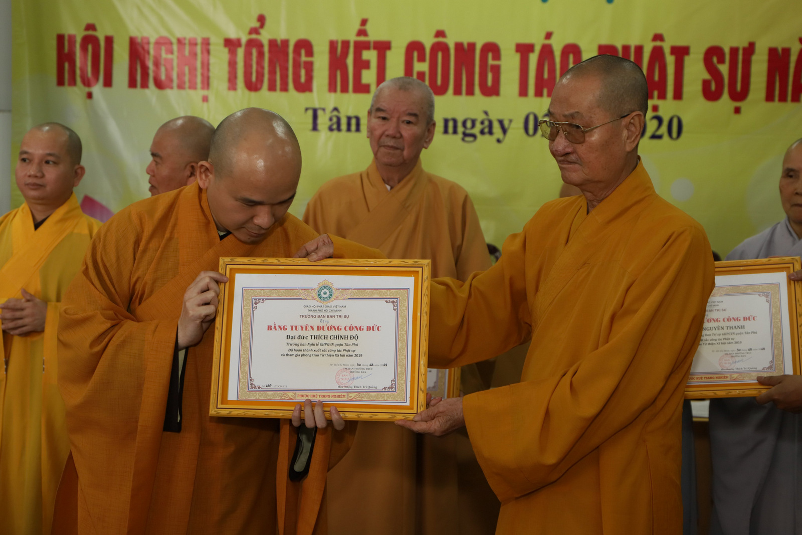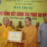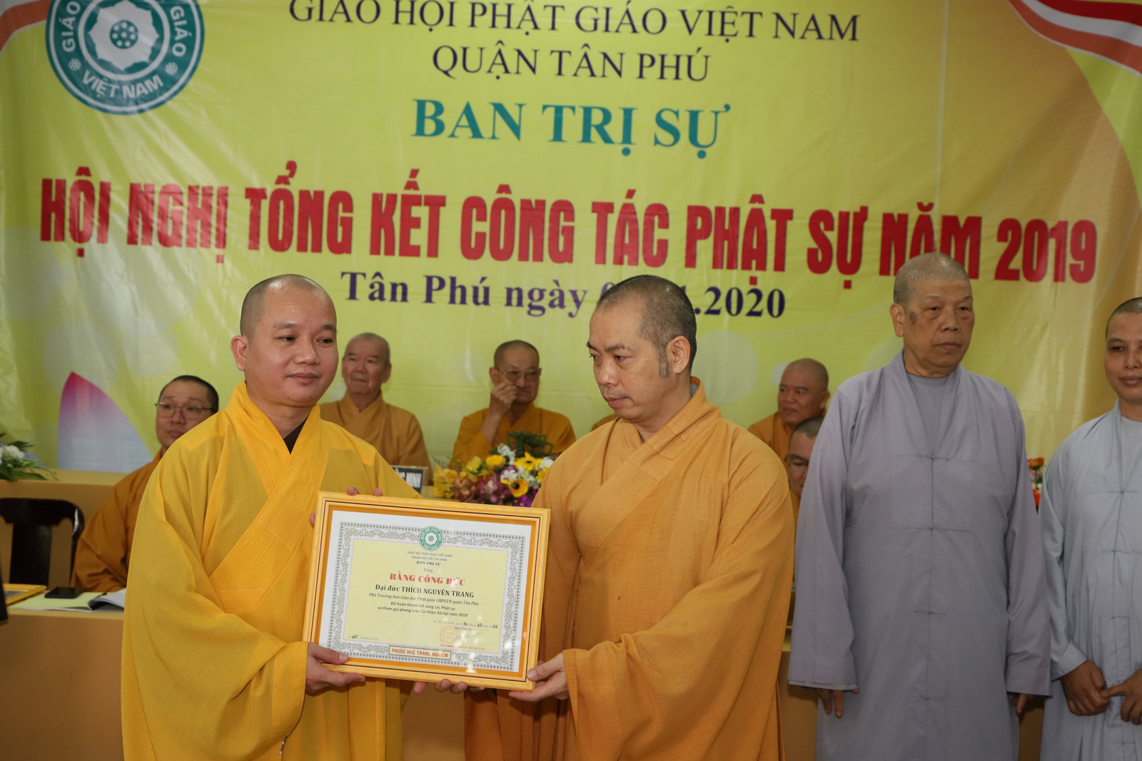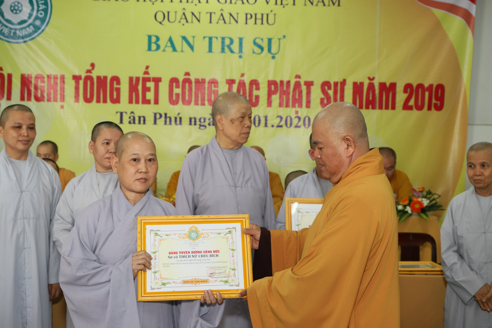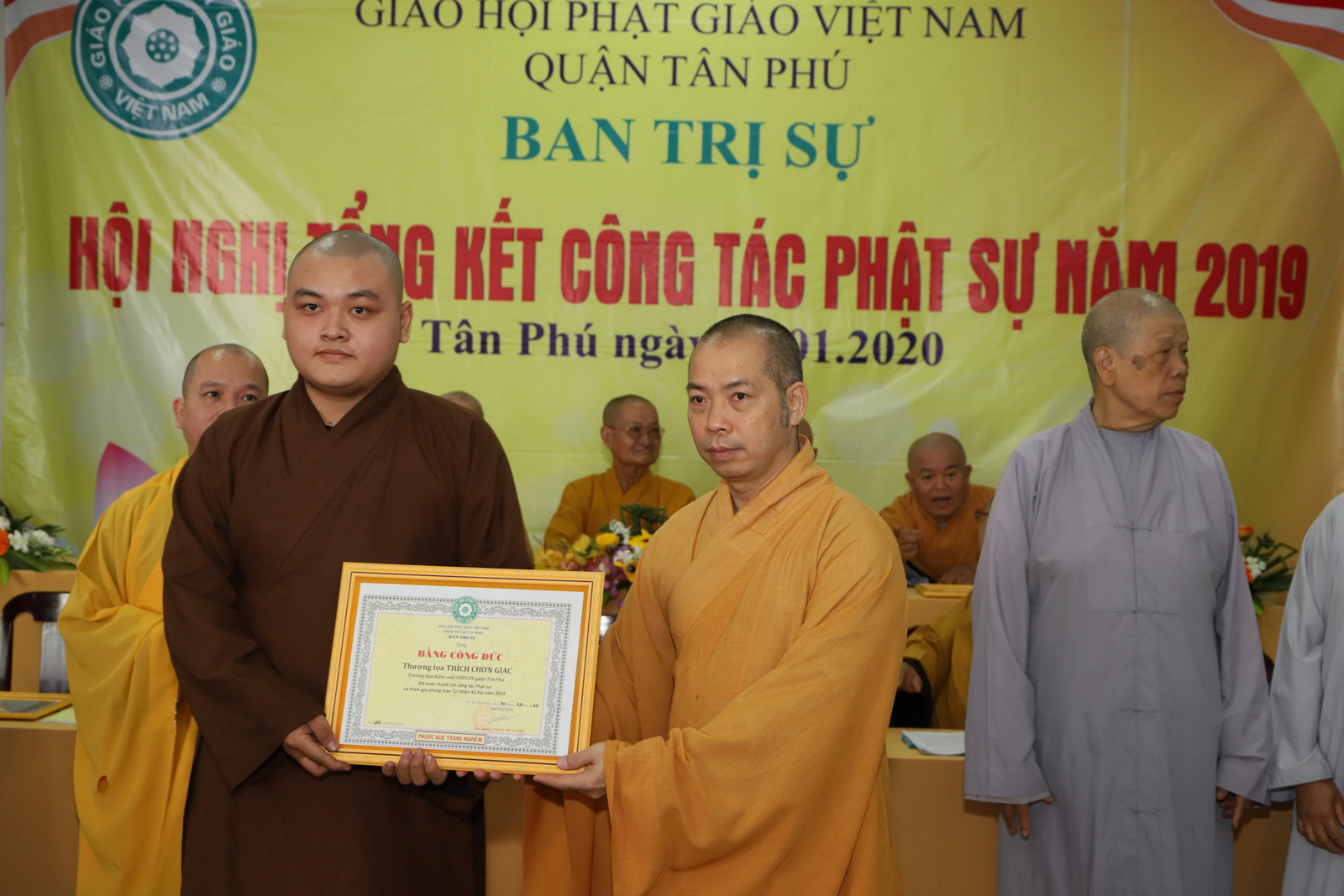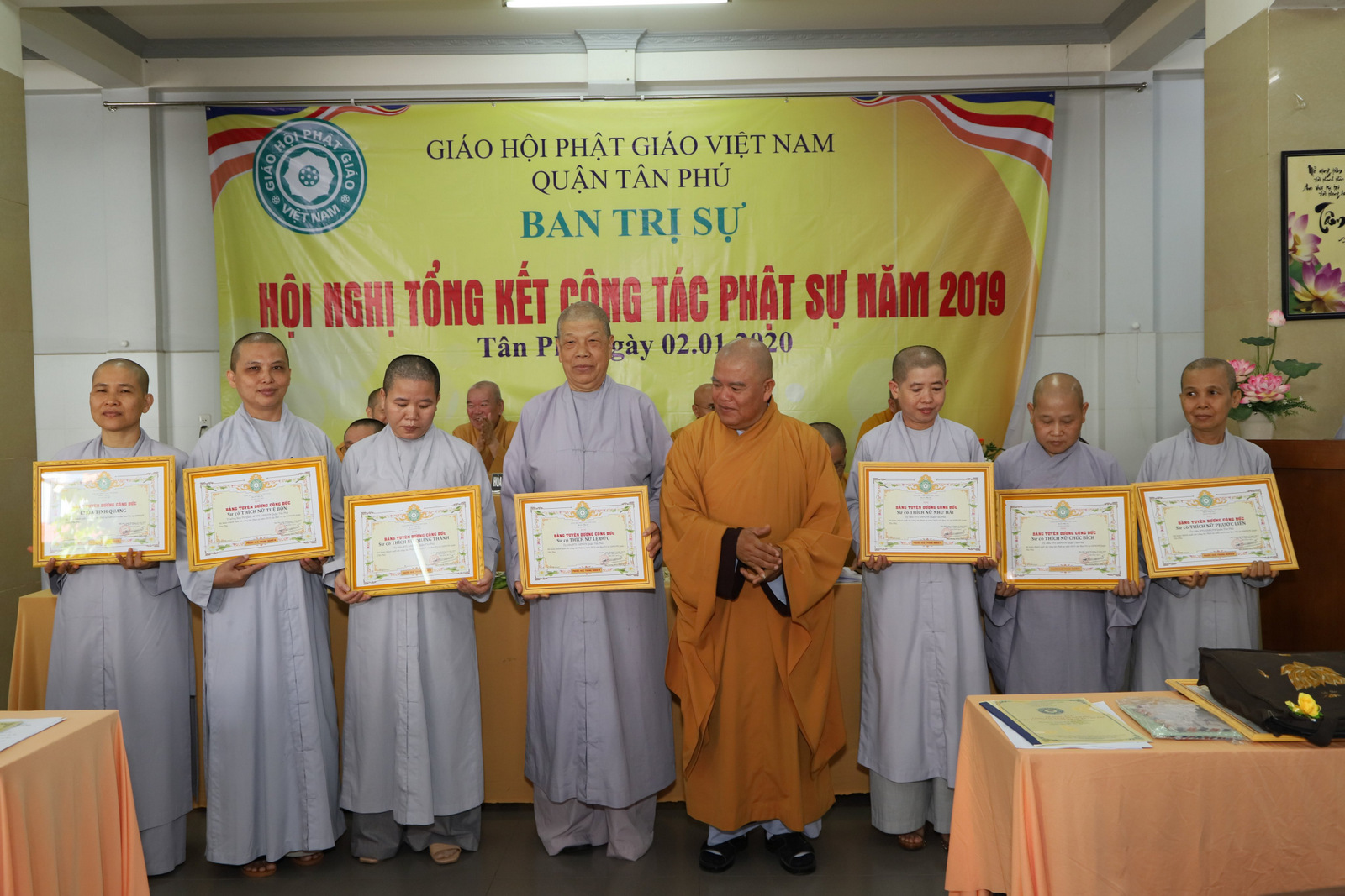Kết thúc buổi lễ, TT. Thích Thiện Quý – Phó trưởng ban kiêm Chánh thư ký BTS GHPGVN TPHCM tán tán, ghi nhận những thành tựu đã đạt được của chư tôn đức BTS GHPGVN Q. Tân Phú, đồng thời tri ân đến các cấp chính quyền địa phương đã hỗ trợ cho BTS PG Q. Tân Phú trong mọi hoạt động Phật sự đã đề ra.  Thượng tọa hy vọng trong năm 2020, BTS GHPGVN Q. Tân Phú tiếp tục phát huy vai trò, trách nhiệm của mình hoàn thành tốt các kết hoạch Phật sự đã đề ra.