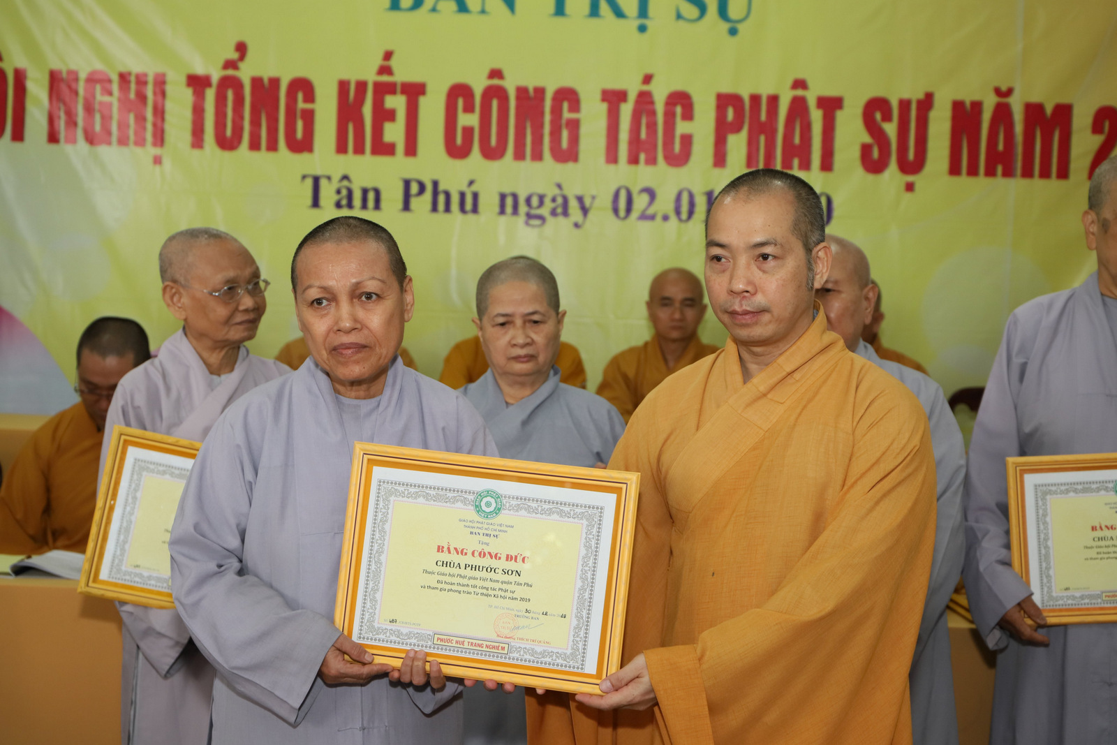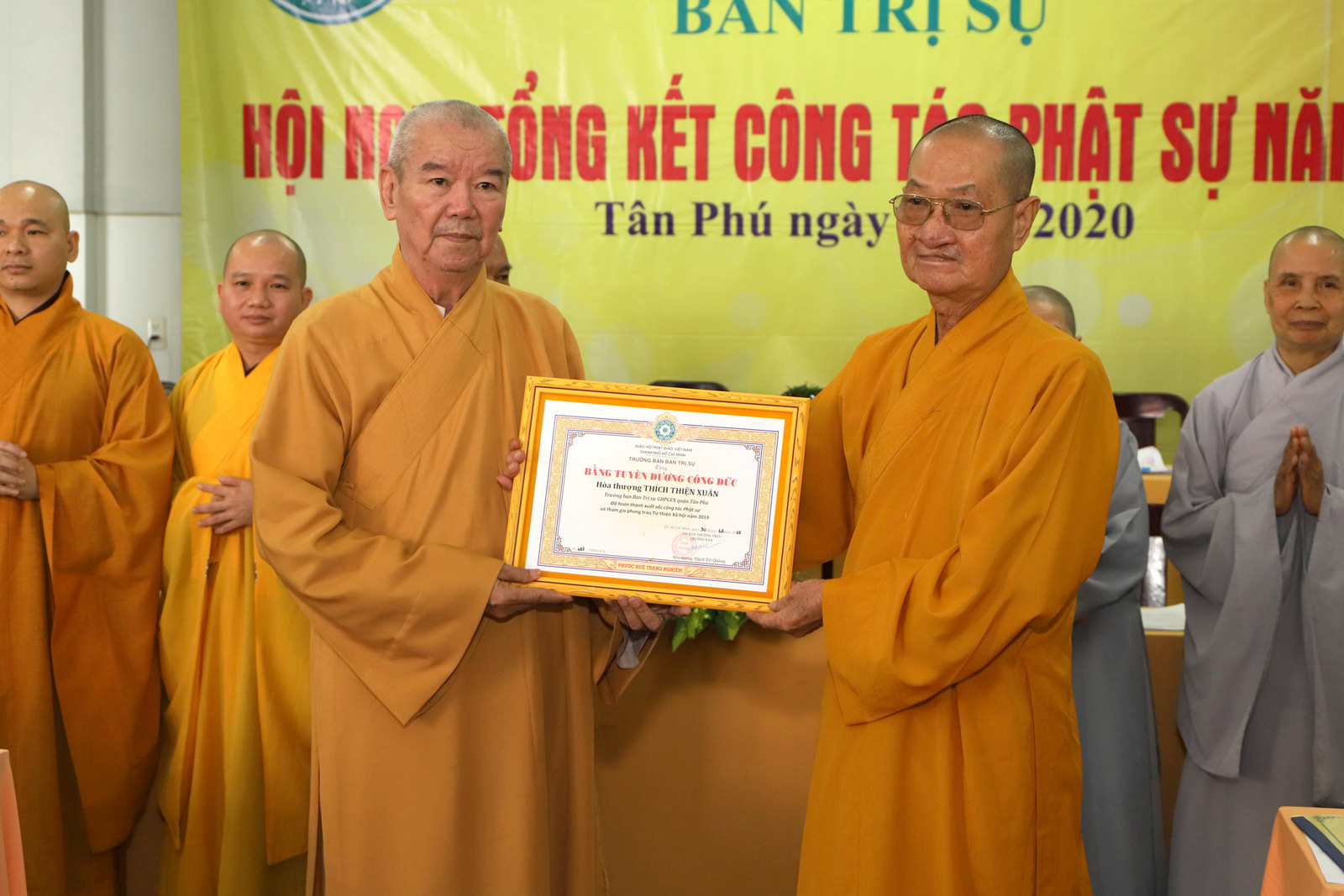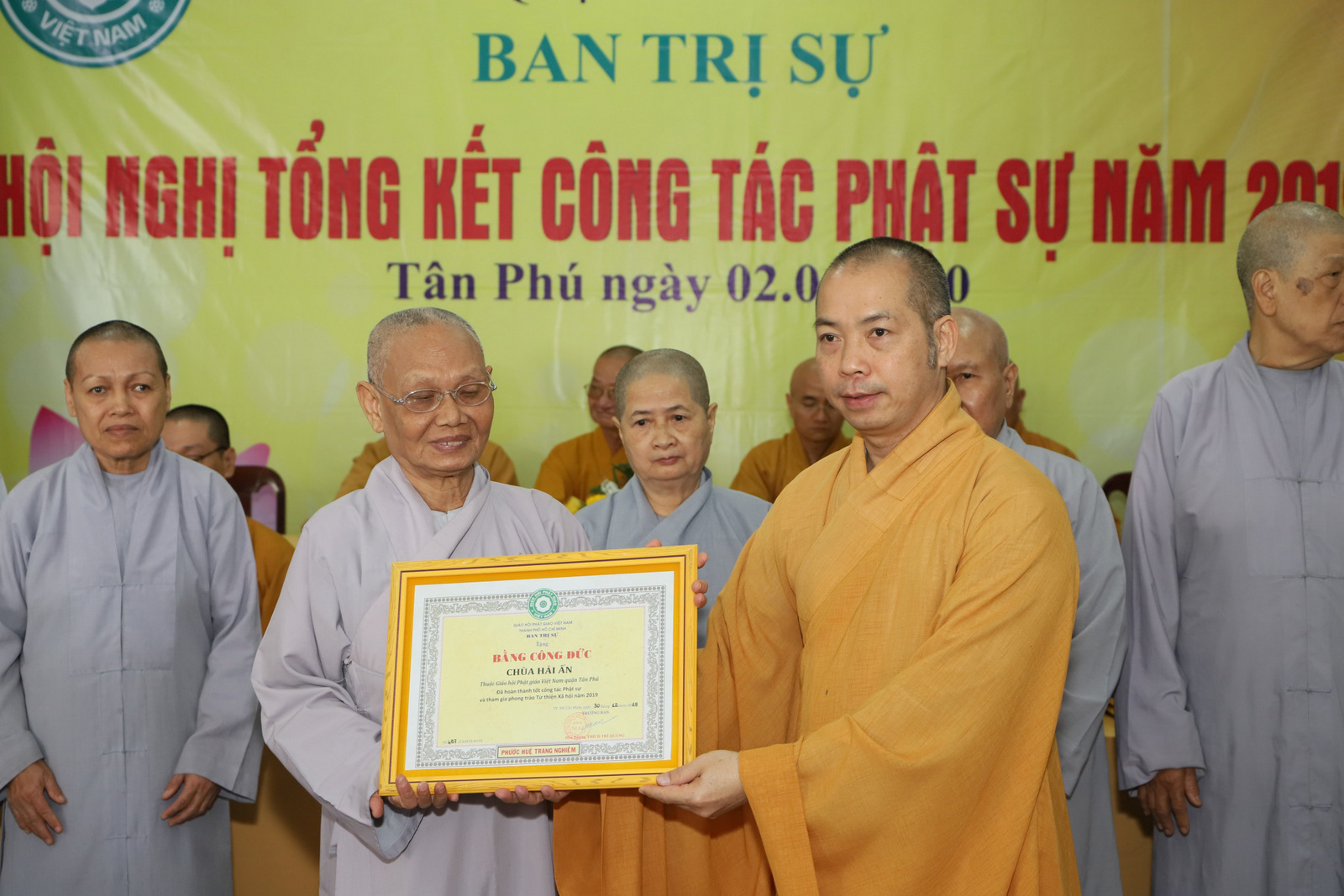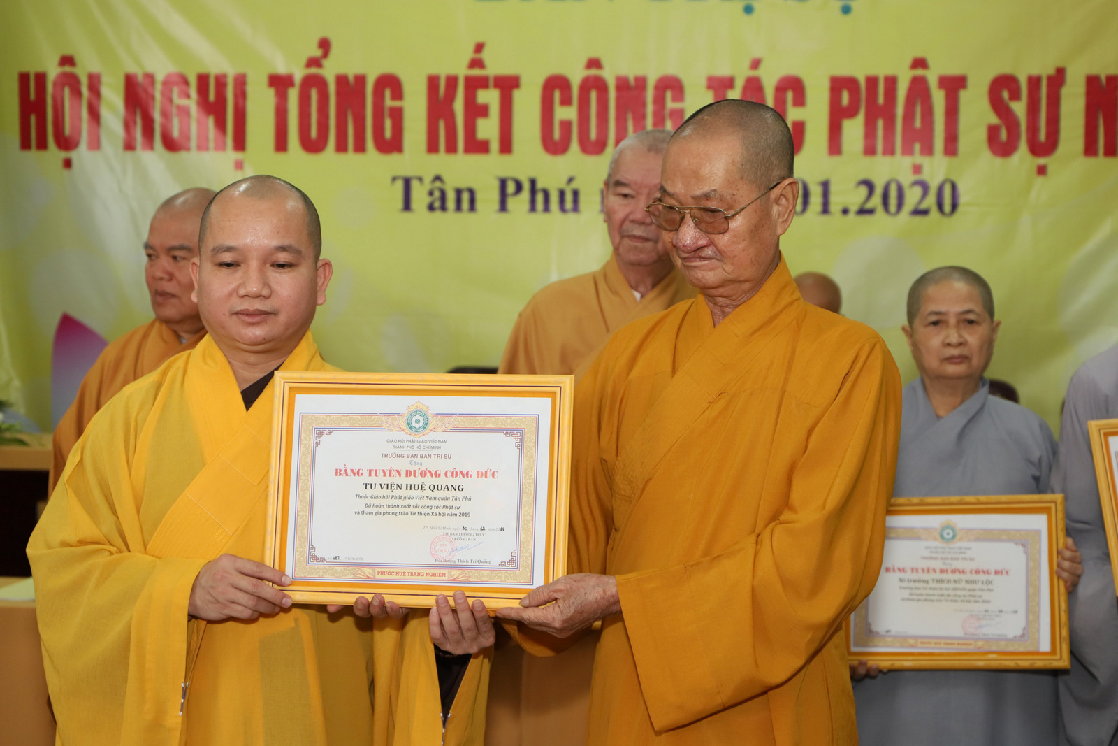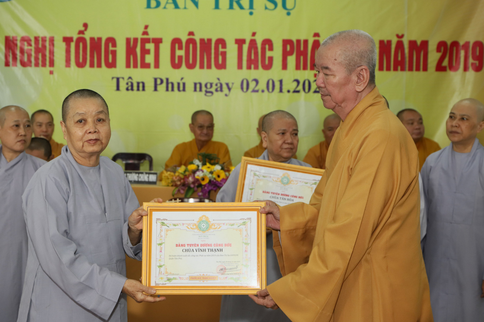 Kết thúc buổi lễ, TT. Thích Thiện Quý – Phó trưởng ban kiêm Chánh thư ký BTS GHPGVN TPHCM tán tán, ghi nhận những thành tựu đã đạt được của chư tôn đức BTS GHPGVN Q. Tân Phú, đồng thời tri ân đến các cấp chính quyền địa phương đã hỗ trợ cho BTS PG Q. Tân Phú trong mọi hoạt động Phật sự đã đề ra.  Thượng tọa hy vọng trong năm 2020, BTS GHPGVN Q. Tân Phú tiếp tục phát huy vai trò, trách nhiệm của mình hoàn thành tốt các kết hoạch Phật sự đã đề ra.