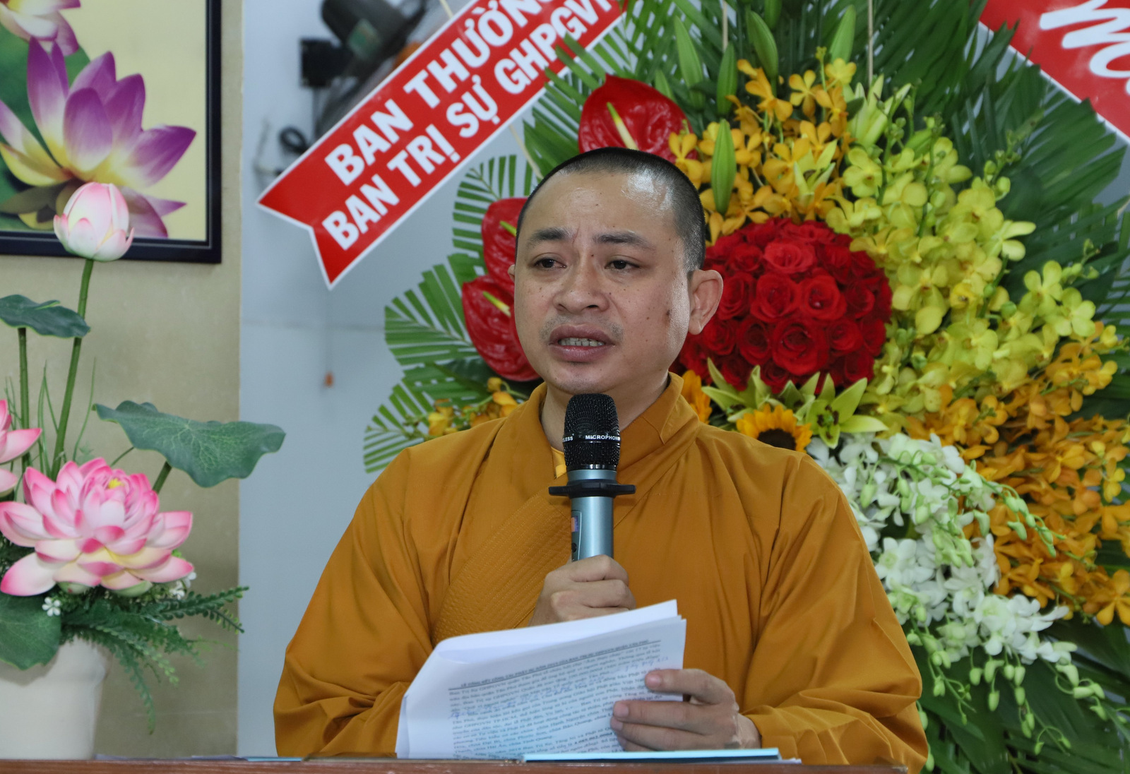 Theo đó, ĐĐ. Thích Quảng Tiến – UV HĐTS, Phó Trưởng ban kiêm Chánh thư ký BTS GHPGVN Q. Tân Phú báo cáo chi tiết các hoạt động Phật sự trong năm 2019 với nhiều thành tựu nổi bậc.