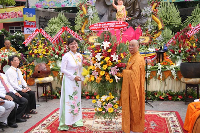 Đại diện chính quyền, Bà Vũ Thị Mỹ Ngọc – Chủ tịch UBMTTQ VN Quận 3, đã có đôi lời phát biểu chúc mừng Phật đản đến Ban trị sự PG Q.3. Và quý quan khách lãnh đạo chính quyền tham dự đã gởi những lẳng hoa tươi thắm chúc mừng buổi lễ.