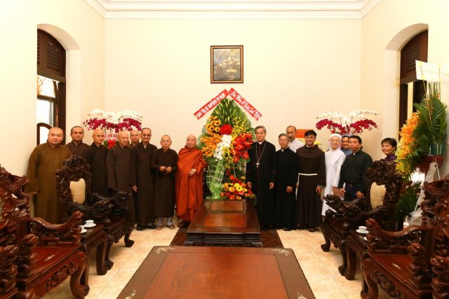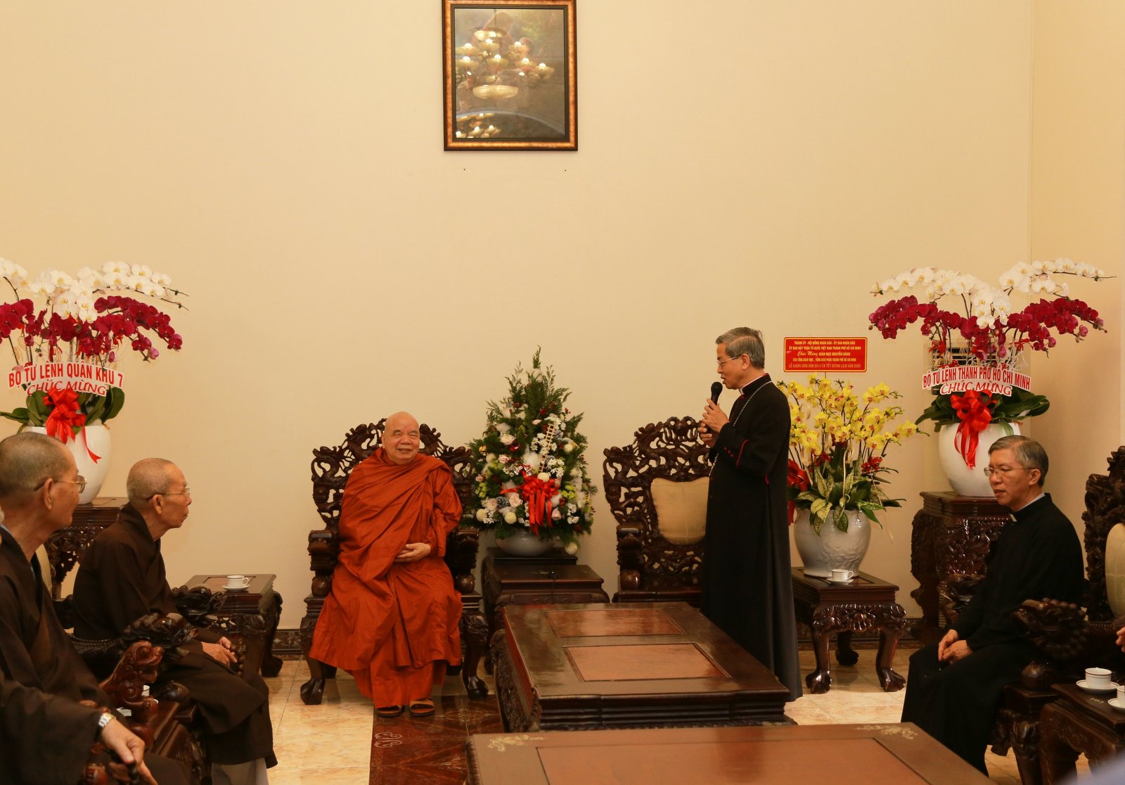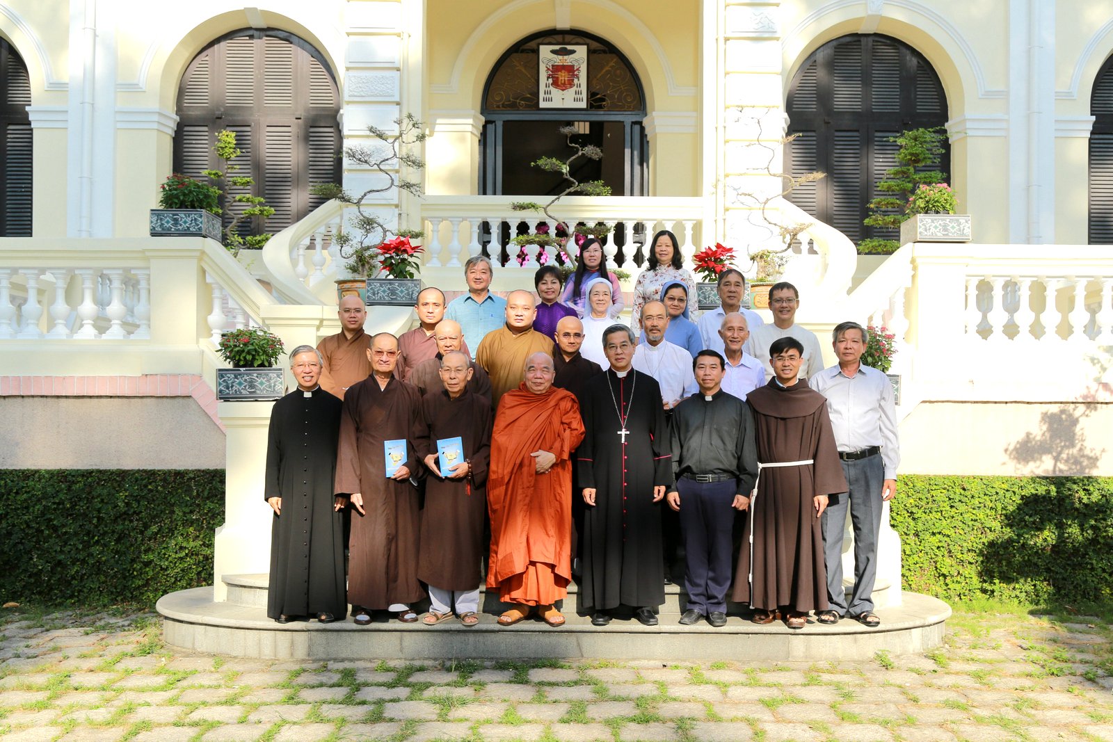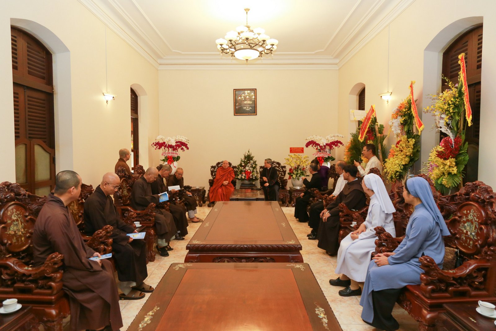 Tại Tòa Tổng Giám Mục TP.HCM, Tổng Giám mục Giuse Nguyễn Năng – Phó Chủ tịch Hội đồng Giám mục VN cùng quý linh mục, nữ tu thân mật đón tiếp chư tôn đức Phật giáo TP.