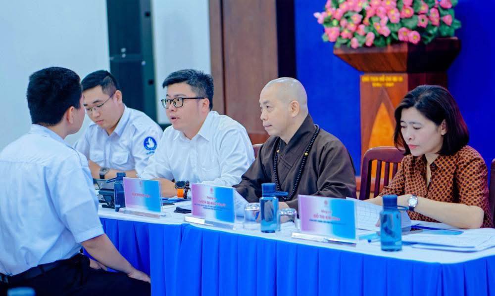 Tiếp đó, các sinh viên lần lượt bước vào vòng phỏng vấn trực tiếp với Thượng tọa Thích Quang Thạnh, chị Đỗ Thị Kim Hoa cùng đại diện Thành đoàn TP.HCM, các ứng viên sẽ trải qua phỏng vấn sơ bộ để đánh giá kỹ năng giao tiếp, khả năng ngoại ngữ, tinh thần làm việc nhóm và cách xử lý tình huống.