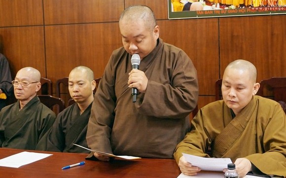 ĐĐ.Thích Trung nguyên – Phó thư ký BTS GHPGVN TP.HCM tuyên đọc quyết định thành phần nhận sự Ban Phật giáo Quốc tế nhiệm kỳ IX (2017 -2022). (ảnh: H.Diệu)