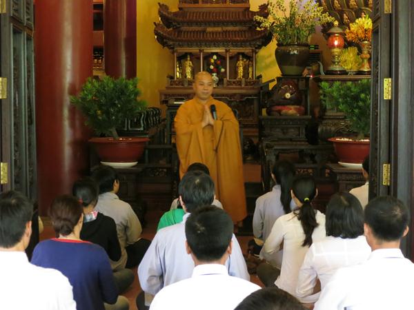 Đón tiếp đoàn, Thượng tọa Thích Trí Thông – phó trụ trì chùa Viên Giác đã hướng dẫn các bạn sinh viên về các oai nghi của người Phật tử tại gia. Các nghi thức cơ bản về cách lễ Phật, thắp hương tụng kinh của người Phật tử được chư tăng chùa Viên Giác tận tình hướng dẫn tỉ mĩ. Đặc biệt sự giải thích rõ ràng về ý nghĩa Tam Qui, Ngũ Giới giúp cho các bạn sinh viên hiểu rõ hơn Phật pháp và càng thêm thâm tín trước khi chính thức trở thành người Phật tử chân chánh