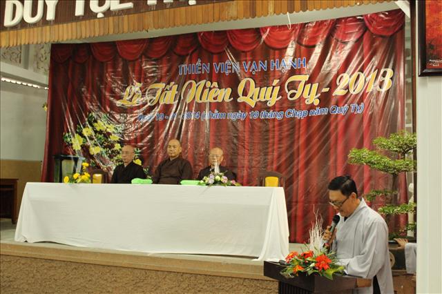 Mở đầu buổi lễ là niệm Phật cầu gia bị, toàn thể hội trường đã lắng đọng tâm tư thành kính tưởng niệm Ân sư Cố Đại lão Hòa thượng thương Minh hạ Châu, Khai sáng, Viện chủ Thiền viện Vạn Hạnh, tiếp theo TT Thích Tâm Chơn, Tri sự Thiền viện trình bày kết quả Phật sự và tu học của chư Tăng cùng quý Phật tử trong năm qua, đồng thời nêu lên những Phật sự trong năm đến.