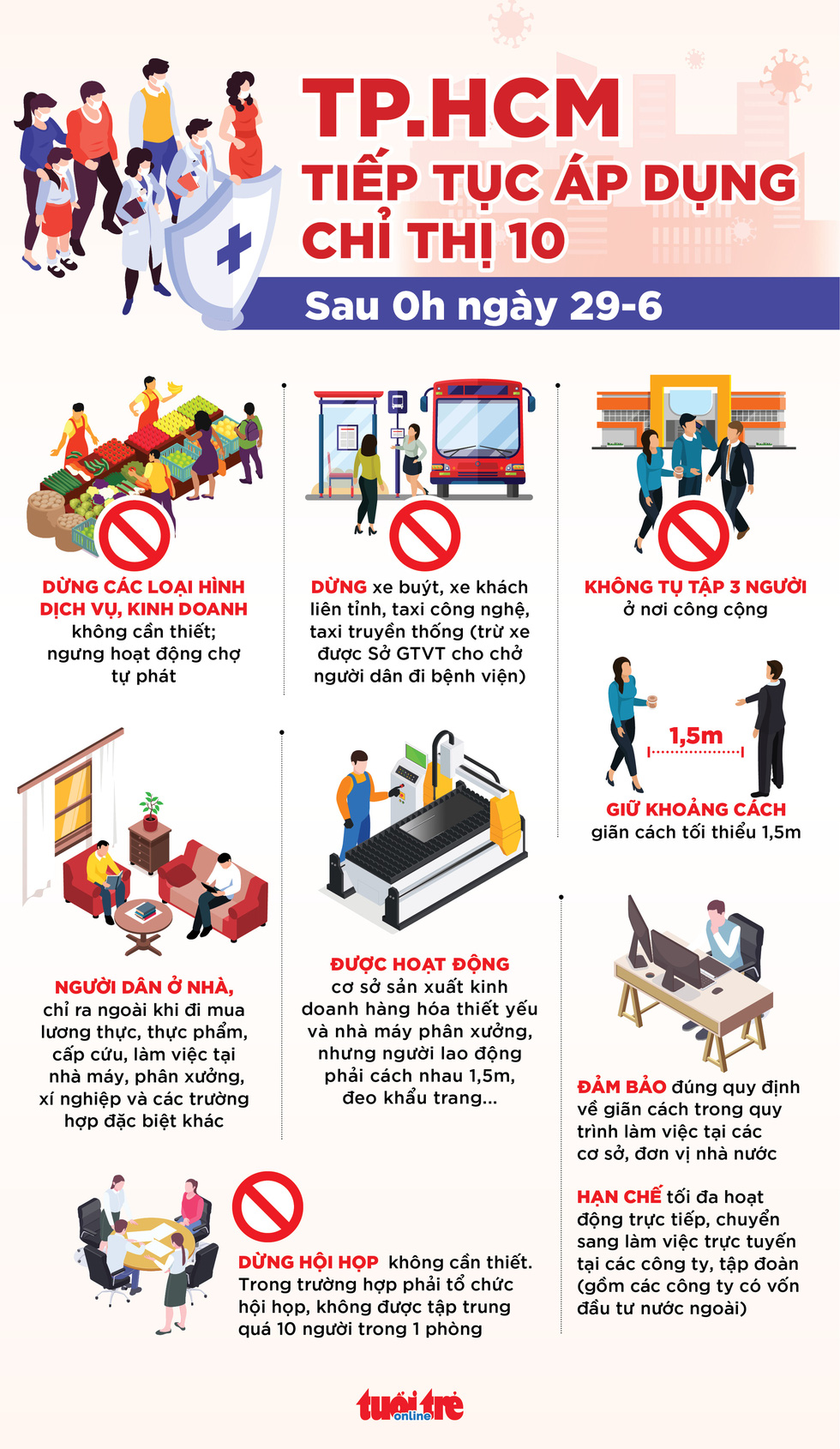 Chiều 28/6, trao đổi với báo chí, Phó chủ tịch UBND TP.HCM Dương Anh Đức cho biết TP sẽ tiếp tục thực hiện chỉ thị 10 sau khi hết thời gian thực hiện giãn cách xã hội đợt 2 (dự kiến kết thúc vào 0h ngày 29/6).