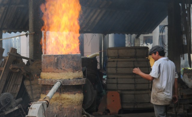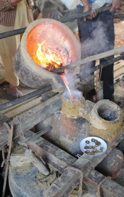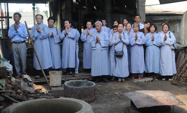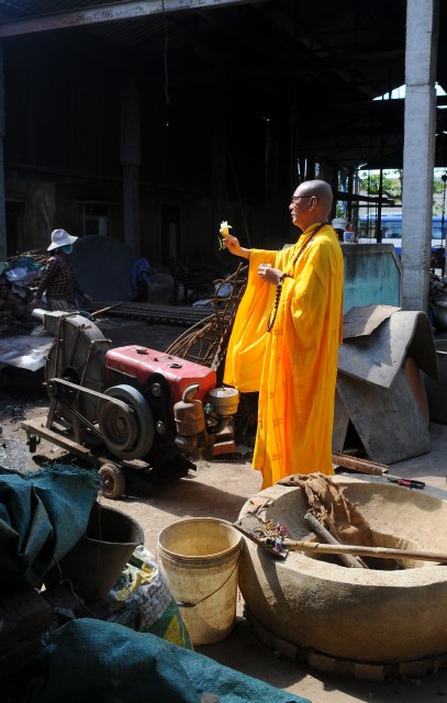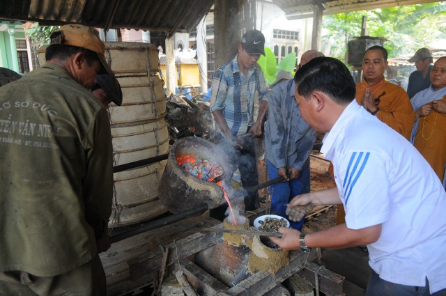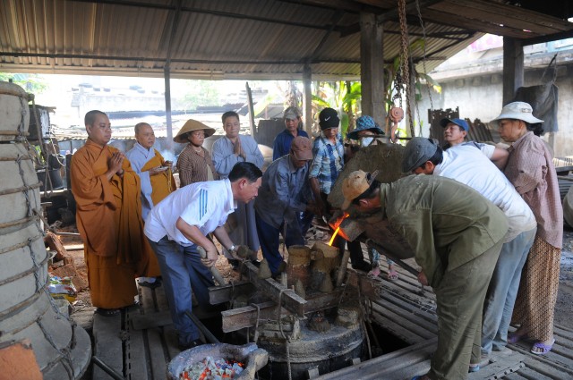 Đúng 9h00 Thượng tọa Thích Phước Cần cùng chư Tăng niêm hương bạch Phật, tiến hành lễ rót đồng đúc chuông.