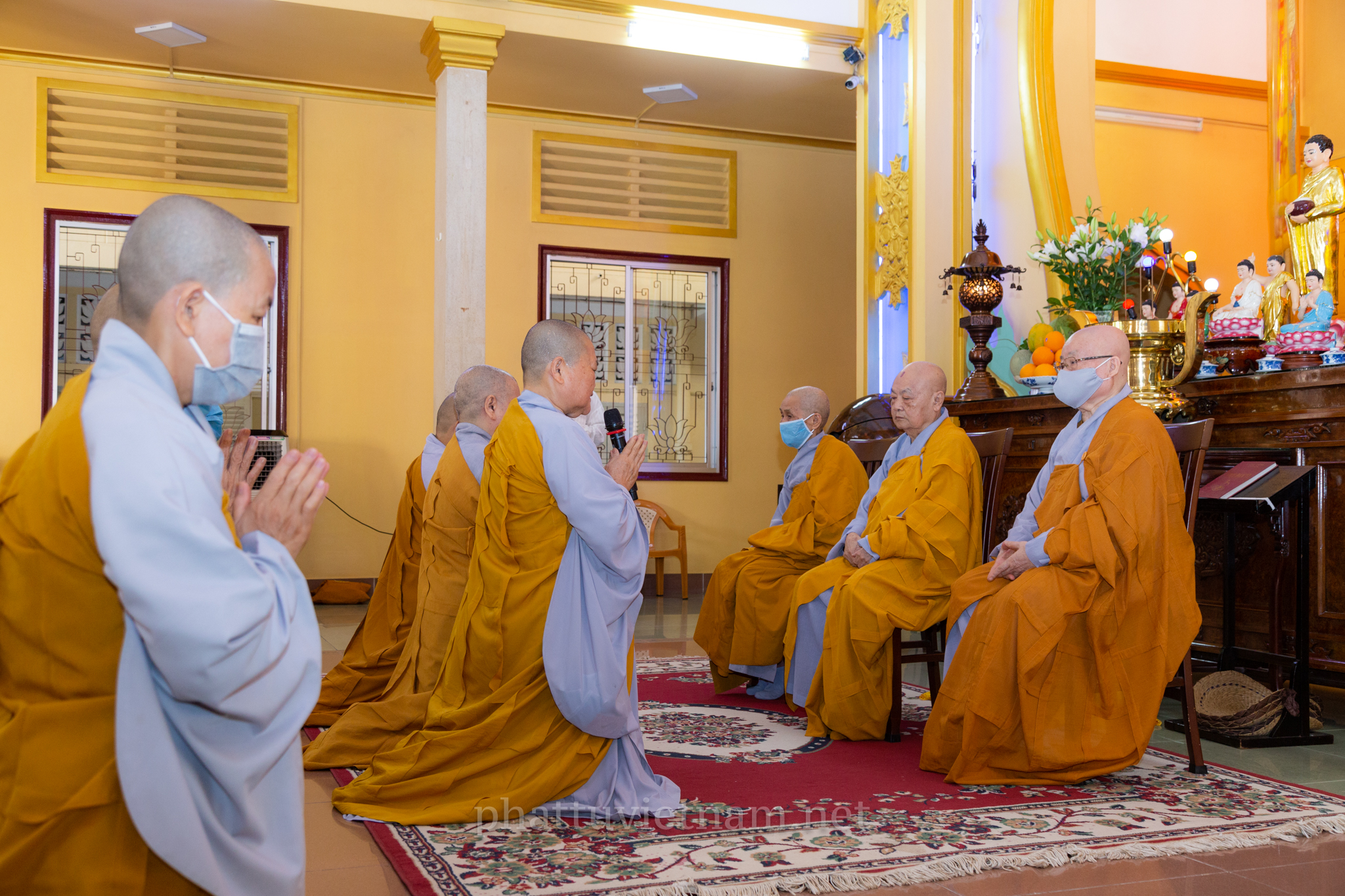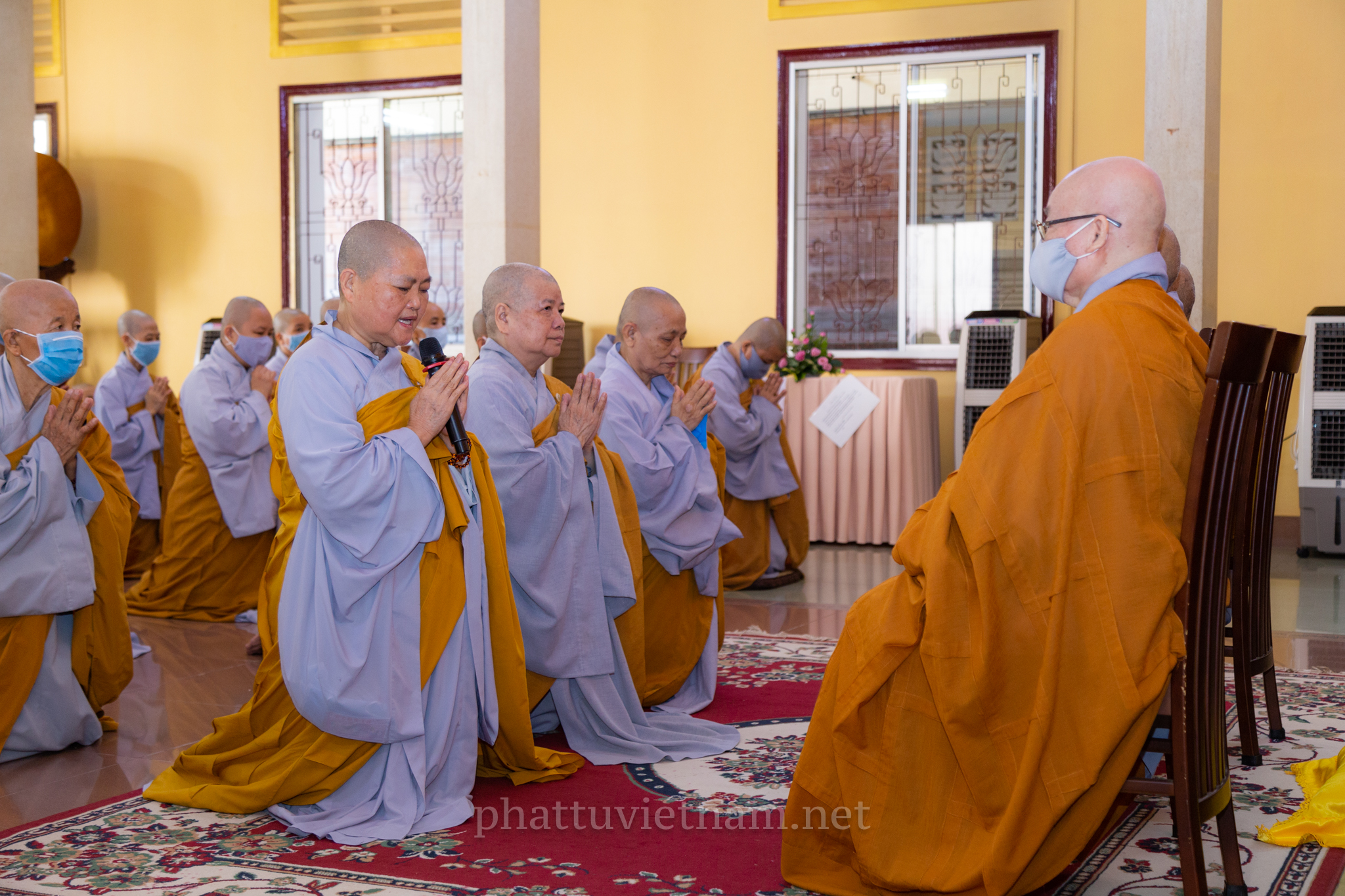 Đáp từ, Ni trưởng cũng có lời tán thán chư Ni trong sự nỗ lực, tinh tấn tu tập trong ba tháng An cư và nhắn nhủ chư Ni sau khi trở về trú xứ cần duy trì nếp sống thanh tịnh, hoà hợp, giữ gìn giới luật, trang nghiêm tự thân trên bước đường hoằng pháp và phụng sự sau ba tháng An cư kiết hạ.