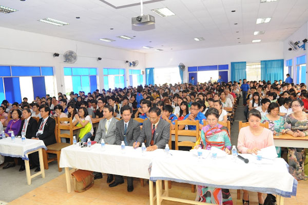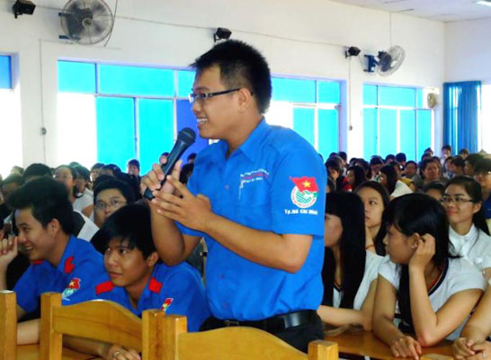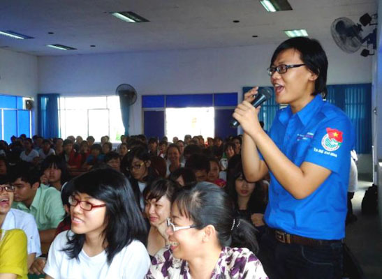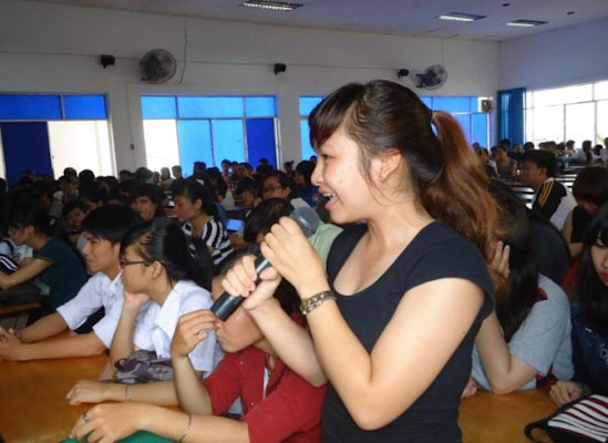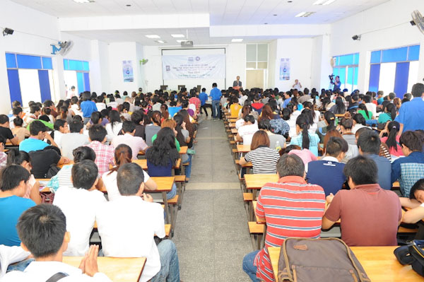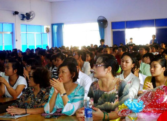 Ngồi trên bàn diễn giả là bác sĩ dinh dưỡng Nguyễn Thị Kim Hưng và Phó Giáo sư – Tiến sĩ Trần Xuân Mai, Phó hiệu trưởng của trường. Trên 500 sinh viên tới tham dự, chưa có em nào ăn chay trường, một số em ăn chay kỳ. Do vậy, diễn đàn ăn chay này với các em thật sự mới mẻ, những gương mặt trong sáng hướng lên 2 vị chuyên gia trong không khí tràn ngập sự trẻ trung và nhiệt thành.