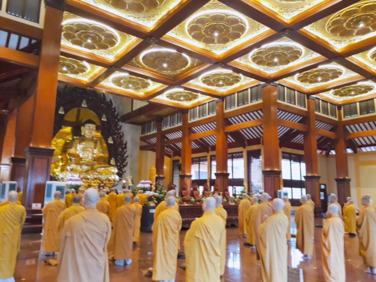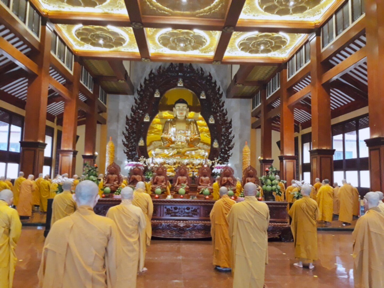 Đúng 6 giờ, HT.Thích Trí Quảng – Phó Pháp chủ kiêm Giám Luật HĐCM, Trưởng Ban Trị sự GHPGVN TP.HCM cùng chư tôn đức lãnh đạo Ban Trị sự GHPGVN TP.HCM, Thường trực BTS Phật giáo 24 quận huyện, các Ban chuyên ngành trực thuộc Phật giáo TP đối trước Tổ đường đảnh lễ chư vị Tổ sư, và quang lâm Chánh điện Việt Nam Quốc Tự cử hành lễ bố-tát tụng giới.