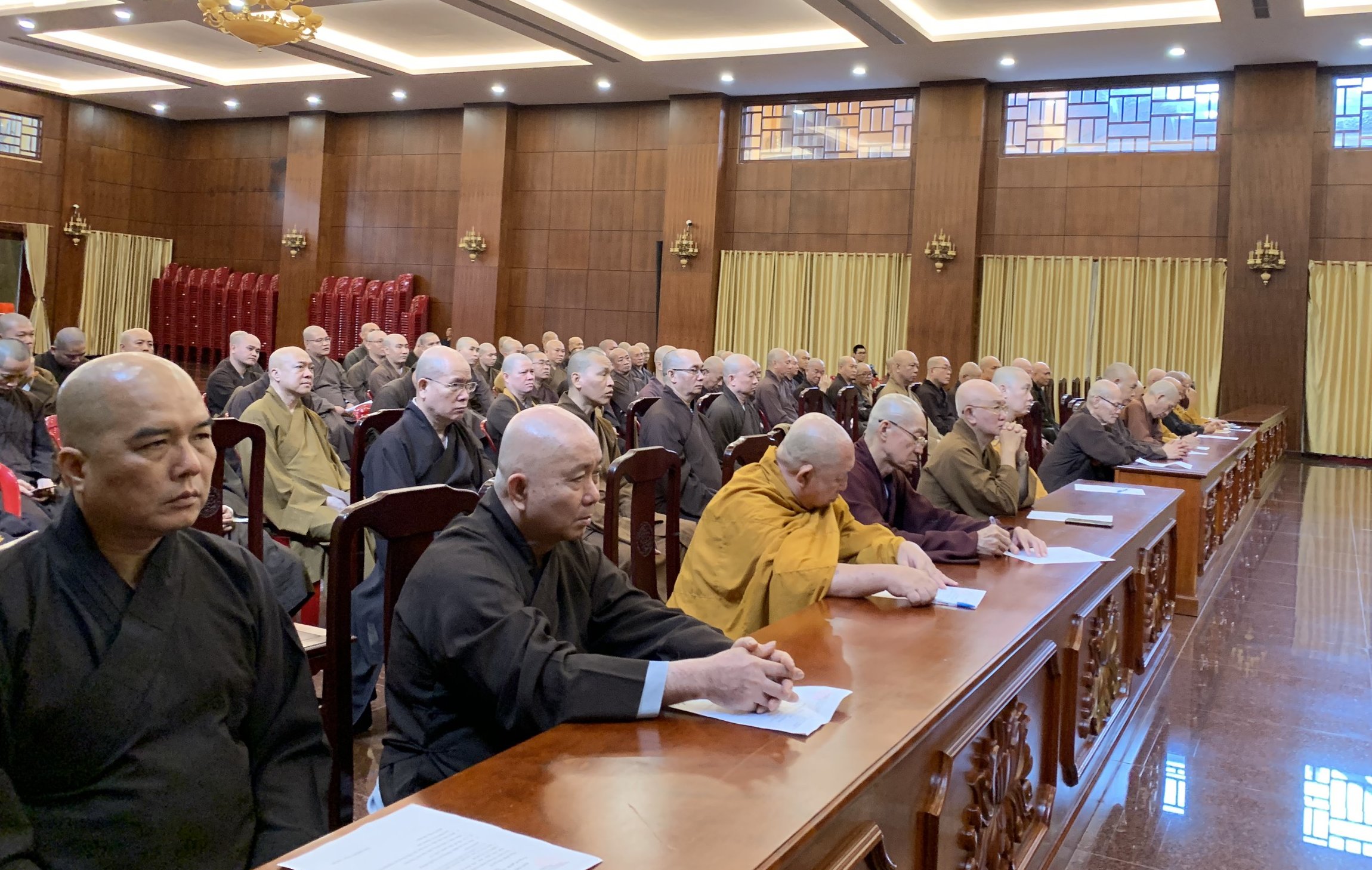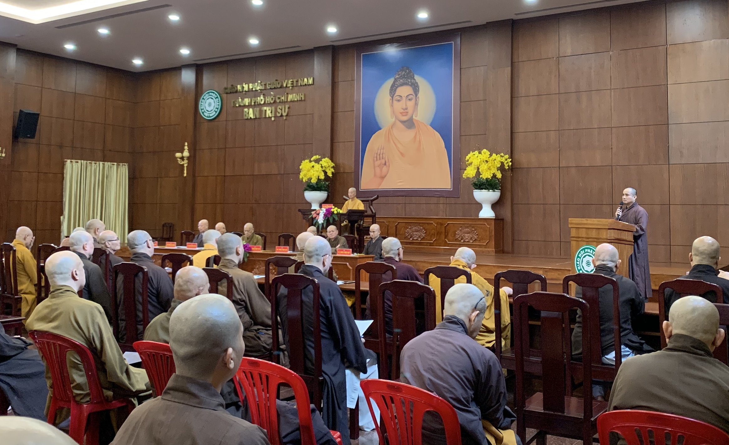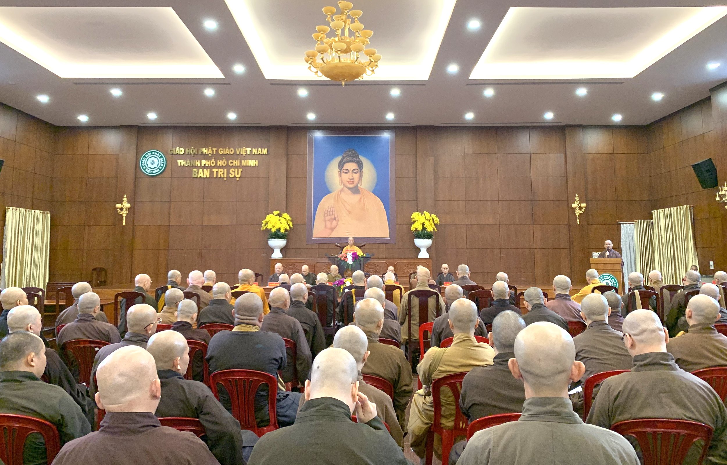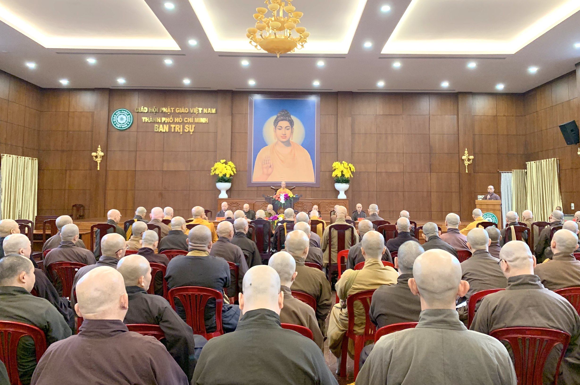 Sau lễ bố tát, Chư tôn đức Ban Trị sự GHPGVN TP.HCM tiếp tục tổ chức phiên họp định kỳ với Thường trực BTS Phật giáo 24 quận huyện, các Ban chuyên ngành trực thuộc Phật giáo TP tại Hội trường VNQT.