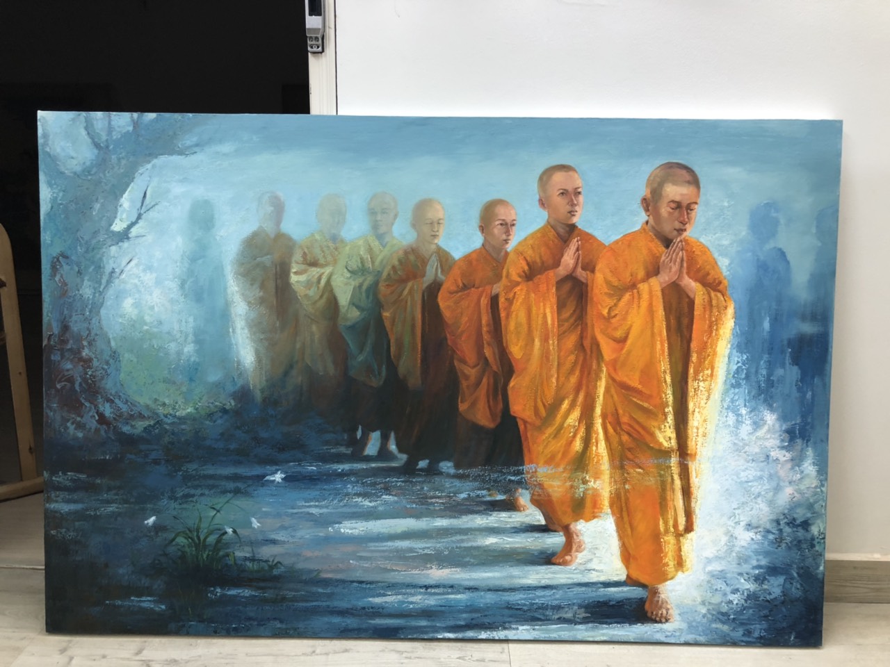 Những bức tranh sống động về chư Phật, về ngài Đạt Ma Tổ sư, Đức Quán Thế Âm vẽ trên lụa, bàn tay bắt ấn, những hình hoa sen, hoa hồng… với gam màu dung dị, tạo nên bản sắc thật riêng của phong cách PHẬT DIỆN Studio.