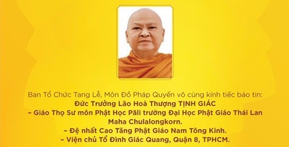 Do niên cao lạp trưởng, Trưởng lão Hòa thượng Tịnh Giác (Visuddhasaramahathero) – Nguyên Giáo thọ sư môn Phật học Pali trường Đại học Phật giáo Thái Lan Maha Chulalongkorn, Bậc tôn túc trưởng lão Phật giáo Nam Tông Kinh, Viện chủ Tổ đình Giác Quang (Q.8) đã viên tịch vào lúc 6 giờ 25 ngày 08 tháng 10 năm 2020 (nhằm ngày 22 tháng 08 năm Canh Tý, Phật lịch 2564), trụ thế 80 năm, 59 hạ lạp tại Tổ đình Giác Quang trong tiếng cầu kinh của chư tôn đức Tăng.