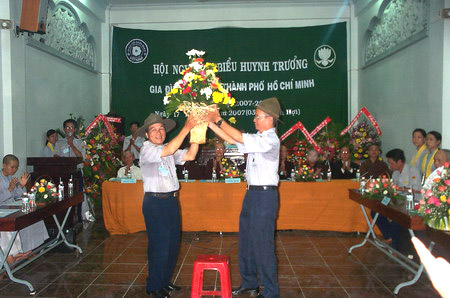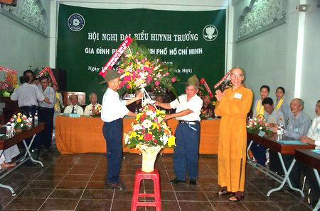 Anh Tâm Duệ Nguyễn Đức Châu tặng hoa cho anh Nguyên Hậu Nguyễn Văn Thuần – nguyên Trưởng Phân Ban GĐPT TP.HCM