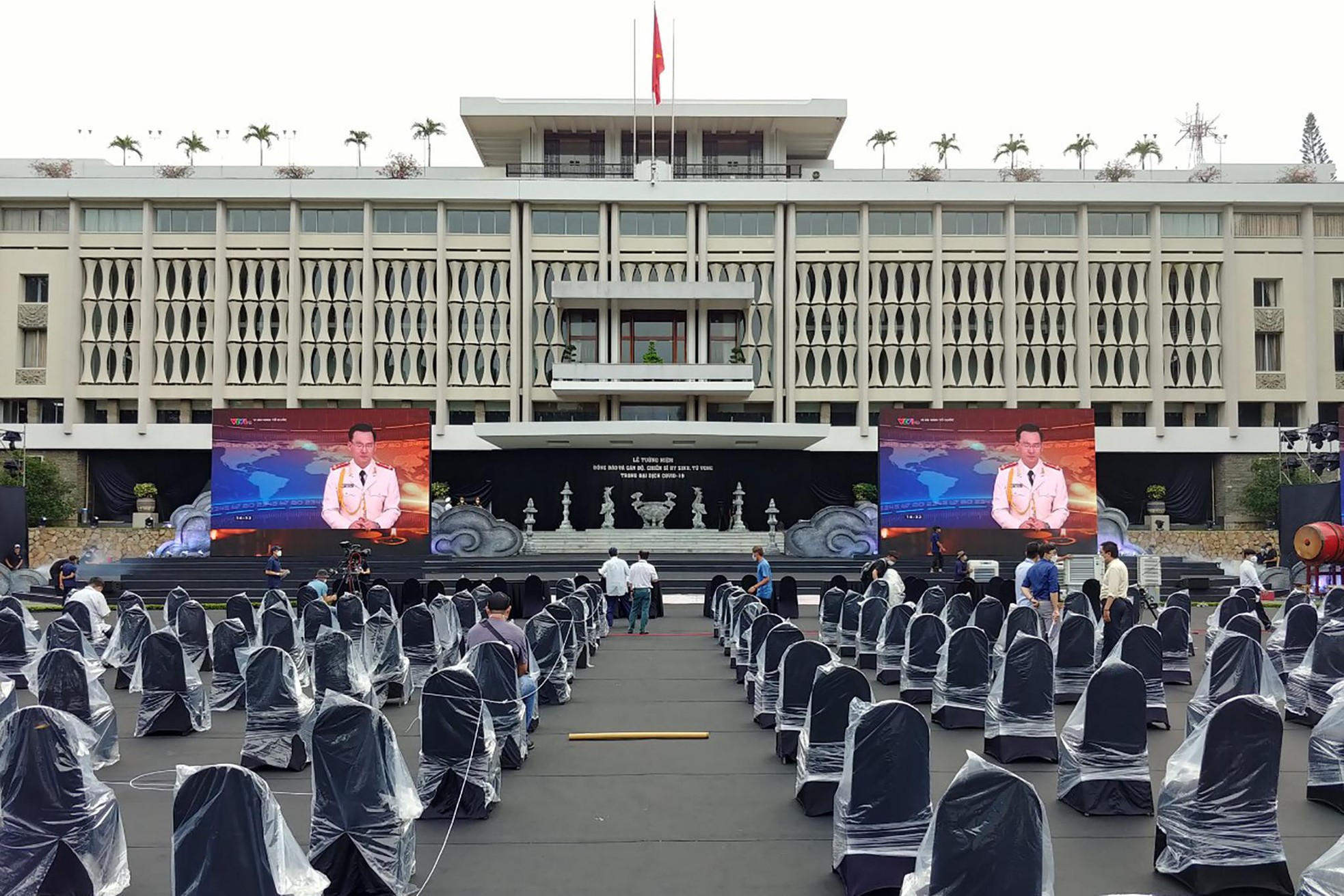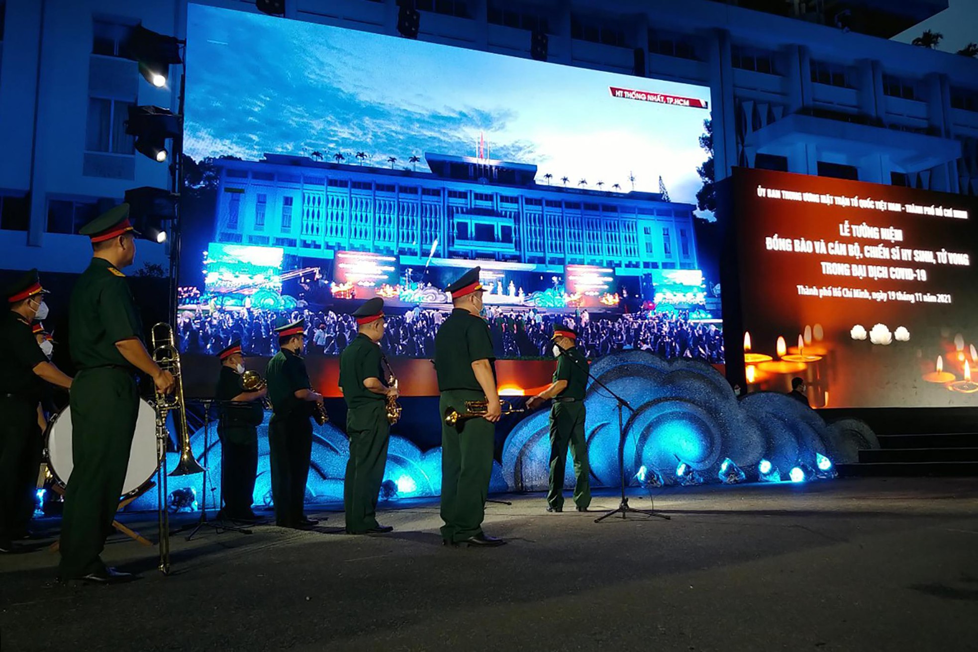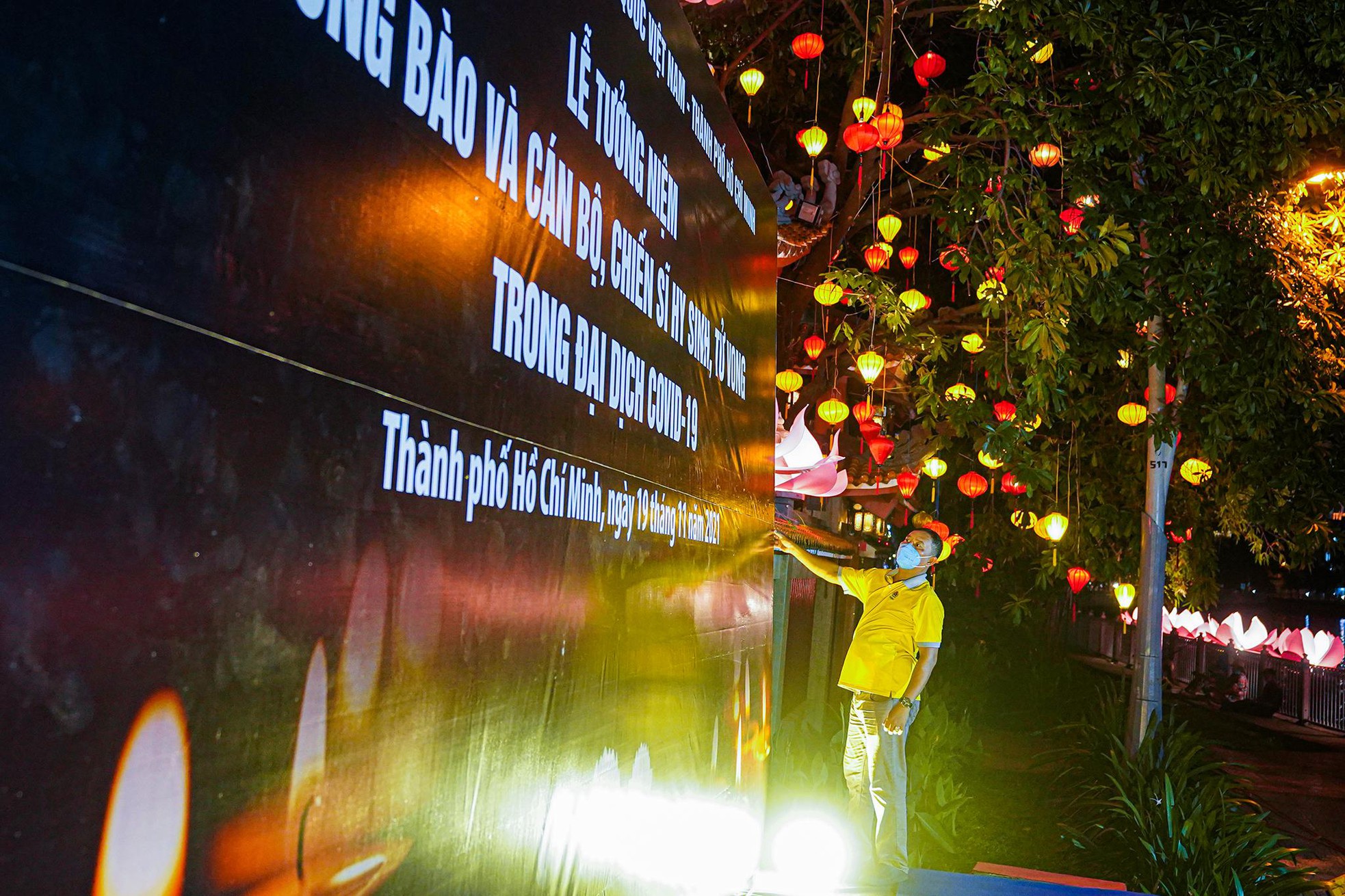 Phía bên trong sân chính hội trường Thống Nhất, nhân viên kỹ thuật sân khấu đang bố trí các hạng mục cuối cùng.Dự kiến, hội trường Thống Nhất sẽ có khoảng 1.000 đại biểu tham dự, trong đó có đại diện lãnh đạo Đảng và Nhà nước, các bộ, ngành Trung ương, lãnh đạo TPHCM và các tỉnh, thành vùng trọng điểm phía Nam. Buổi lễ cũng có sự tham dự của một số thân nhân, gia đình có người mất do COVID-19.Sân khấu chính của buổi lễ được đang dần hình thành.Khoảng 18h, một số bộ phận chạy thử chương trình, ráp nối kịch bản.Chương trình dự kiến sẽ trình chiếu một số hình ảnh, phóng sự về những ngày tháng TPHCM cam go chống dịch COVID-19. Sau đó các đại biểu tham dự thực hiện nghi thức thắp nến tưởng niệm đồng bào và cán bộ, chiến sĩ hy sinh, tử vong trong đại dịch COVID-19.Nhân viên kỹ thuật sân khấu đang điều chỉnh lại phông nền, điều chỉnh phù hợp khung hình máy quay để phục vụ chương trình truyền hình trực tiếp.Tại điểm cầu chùa Pháp Hoa, sân khấu, phông nền đã được dựng lên. Theo tinh thần kêu gọi của lãnh đạo thành phố, các cơ sở tôn giáo trên địa bàn tùy theo tình hình thực tế mà tổ chức buổi lễ phù hợp và cùng đánh chuông tưởng niệm.Theo một phật tử làm công quả tại chùa, khoảng 3000 chiếc đèn hoa đã được chuẩn bị để phục vụ lễ tưởng niệm