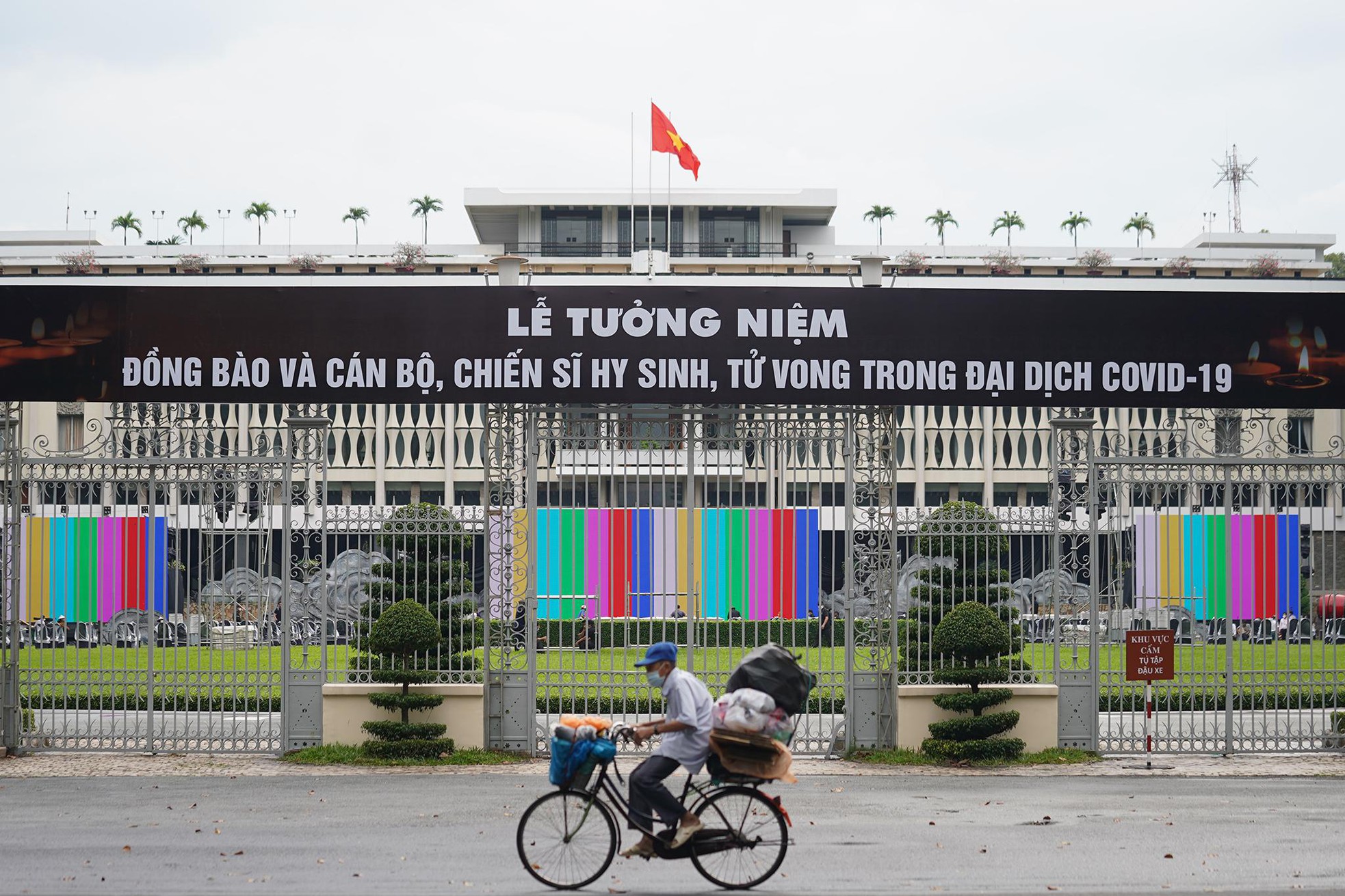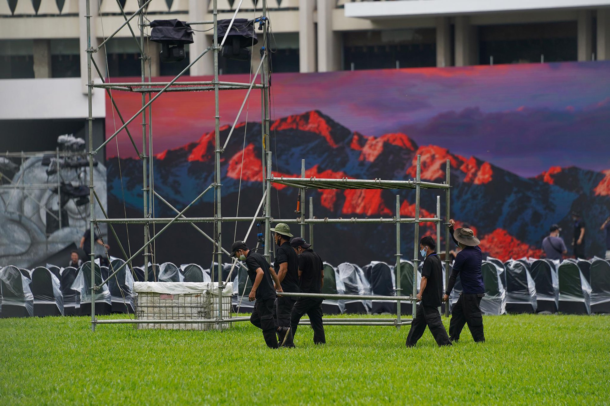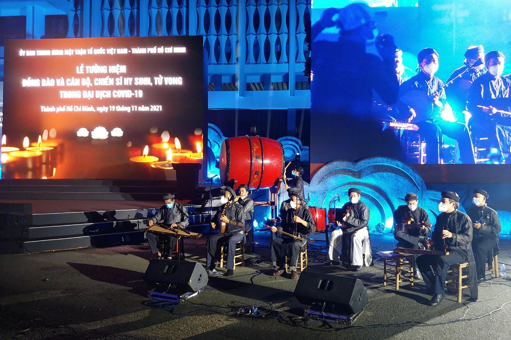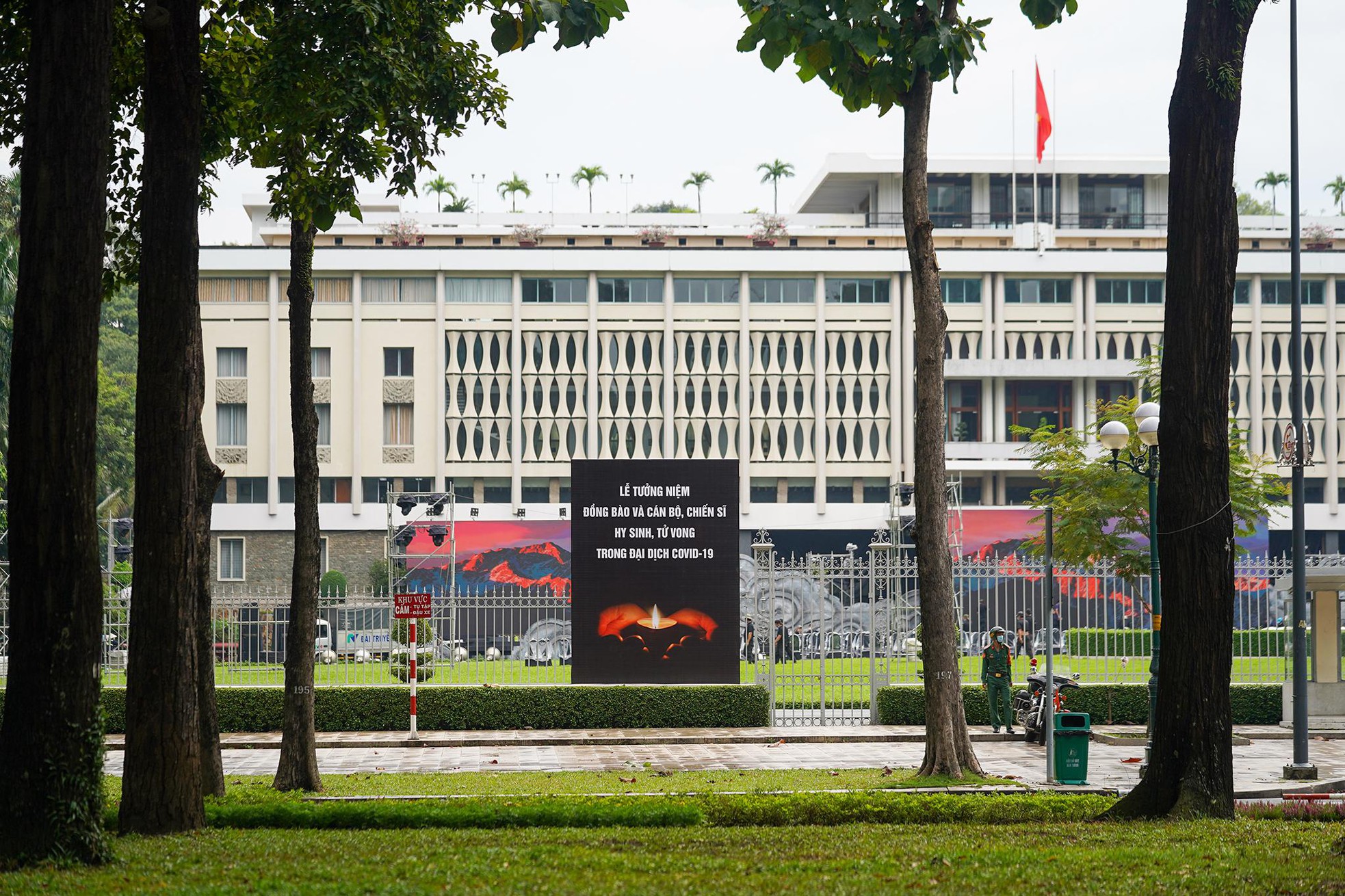 Phía bên trong sân chính hội trường Thống Nhất, nhân viên kỹ thuật sân khấu đang bố trí các hạng mục cuối cùng.Dự kiến, hội trường Thống Nhất sẽ có khoảng 1.000 đại biểu tham dự, trong đó có đại diện lãnh đạo Đảng và Nhà nước, các bộ, ngành Trung ương, lãnh đạo TPHCM và các tỉnh, thành vùng trọng điểm phía Nam. Buổi lễ cũng có sự tham dự của một số thân nhân, gia đình có người mất do COVID-19.Sân khấu chính của buổi lễ được đang dần hình thành.Khoảng 18h, một số bộ phận chạy thử chương trình, ráp nối kịch bản.Chương trình dự kiến sẽ trình chiếu một số hình ảnh, phóng sự về những ngày tháng TPHCM cam go chống dịch COVID-19. Sau đó các đại biểu tham dự thực hiện nghi thức thắp nến tưởng niệm đồng bào và cán bộ, chiến sĩ hy sinh, tử vong trong đại dịch COVID-19.Nhân viên kỹ thuật sân khấu đang điều chỉnh lại phông nền, điều chỉnh phù hợp khung hình máy quay để phục vụ chương trình truyền hình trực tiếp.Tại điểm cầu chùa Pháp Hoa, sân khấu, phông nền đã được dựng lên. Theo tinh thần kêu gọi của lãnh đạo thành phố, các cơ sở tôn giáo trên địa bàn tùy theo tình hình thực tế mà tổ chức buổi lễ phù hợp và cùng đánh chuông tưởng niệm.Theo một phật tử làm công quả tại chùa, khoảng 3000 chiếc đèn hoa đã được chuẩn bị để phục vụ lễ tưởng niệm